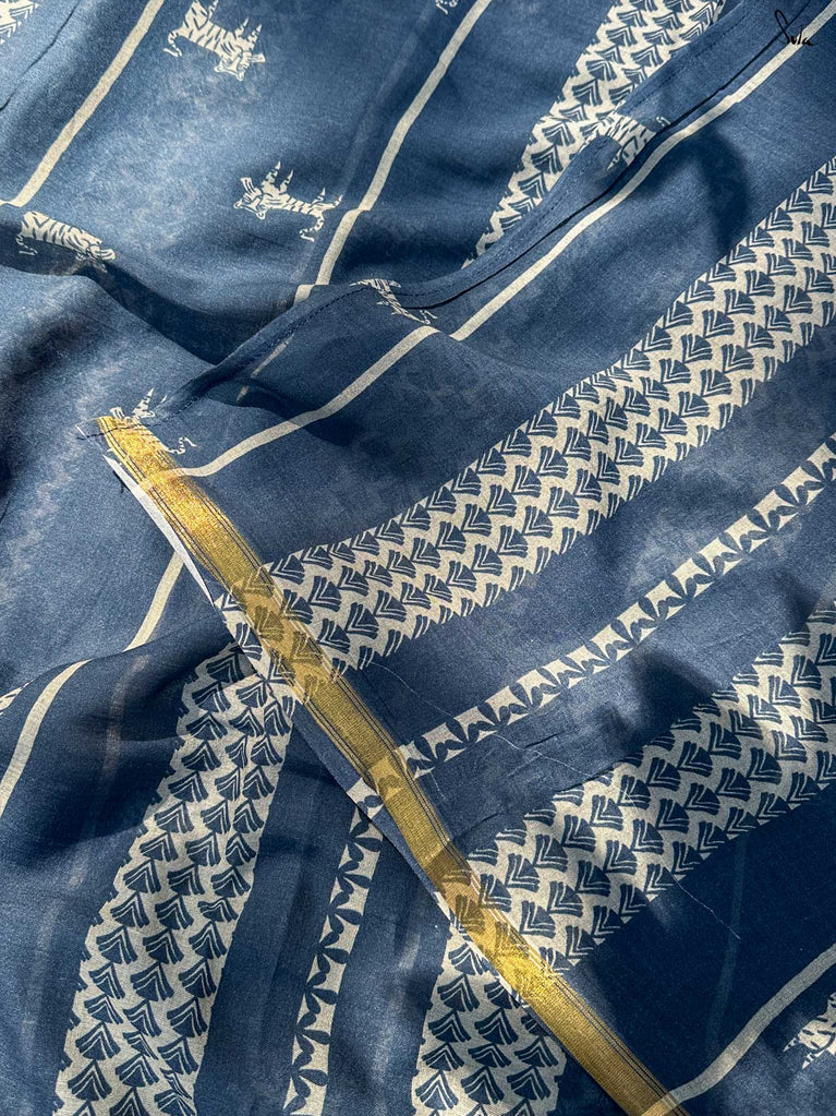 This uniquely beautiful grey, mustard and maroon made in heaven mul saree is truly a sight to behold!