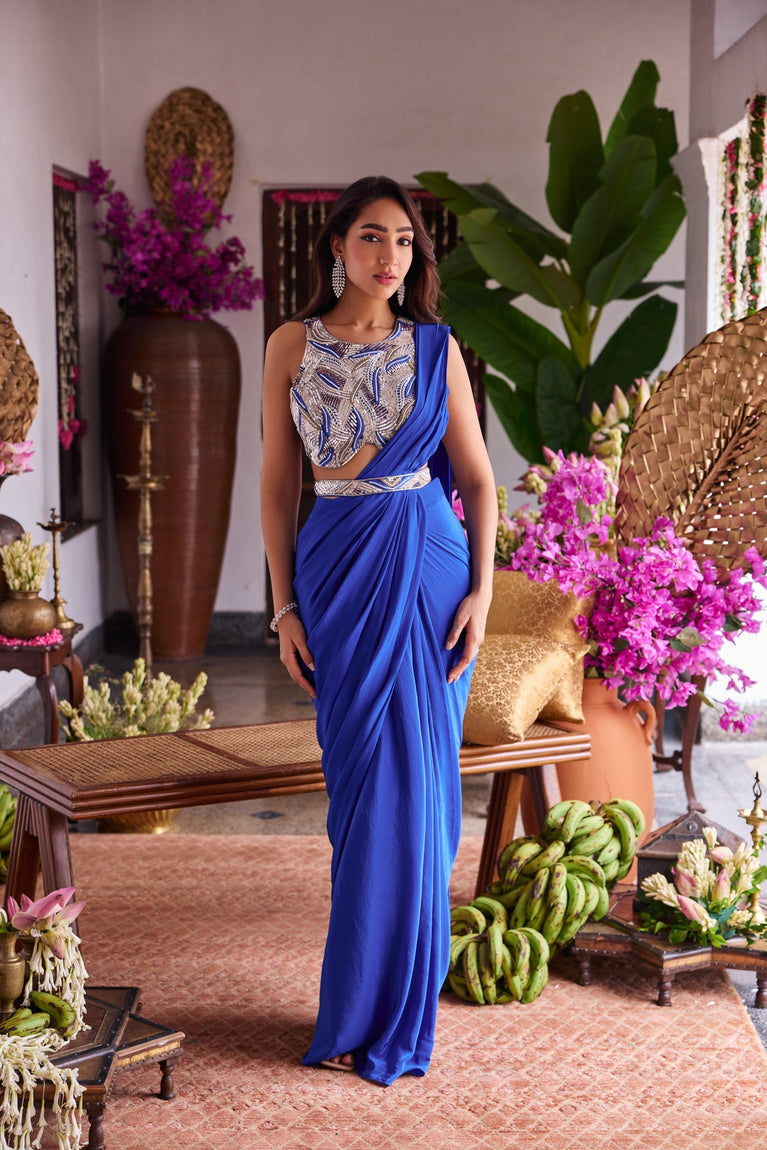 Blue Crepe Drape Saree With Embroidery Blouse