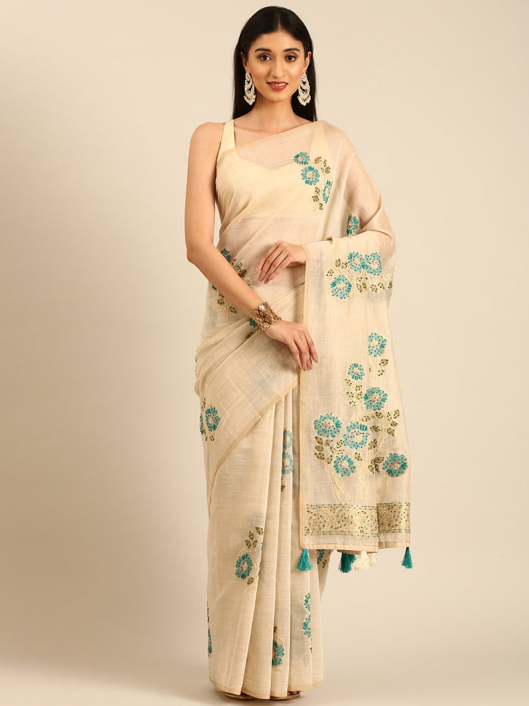 Cream Chanderi Silk Saree With Sequins And French Knot Embroidery