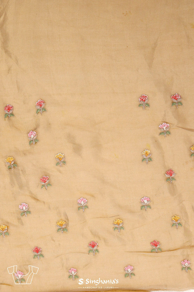 This alluring tissue saree in cream gold has floral butti embroidery all over the body with intricately embroidered small, colourful floral border in sequins and threadwork. It's a great choice for dressing up for a wedding or even for a festive occasion.