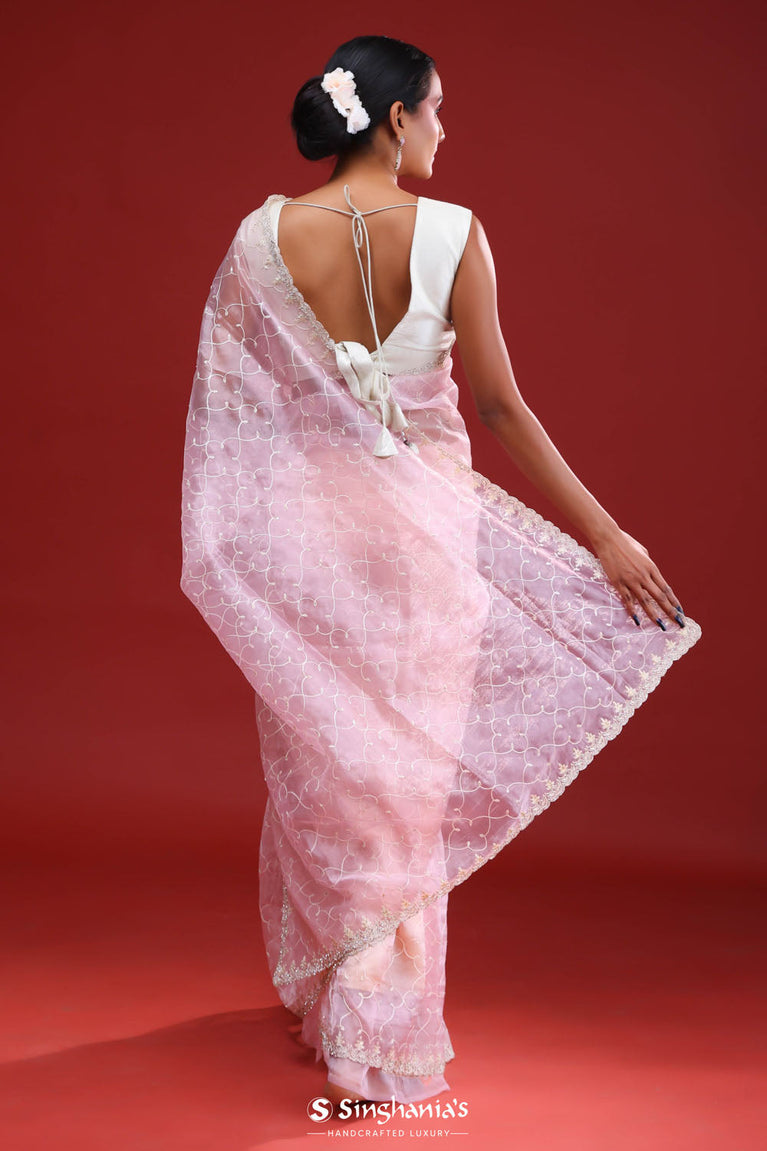 This beautiful cotton pink organza saree is ideal for party and festive celebrations. The delicate floral jaali work on the body, enhanced by a minimal floral work in sequins and glass beads, creates a luxurious and refreshing look. Includes a matching blouse piece.