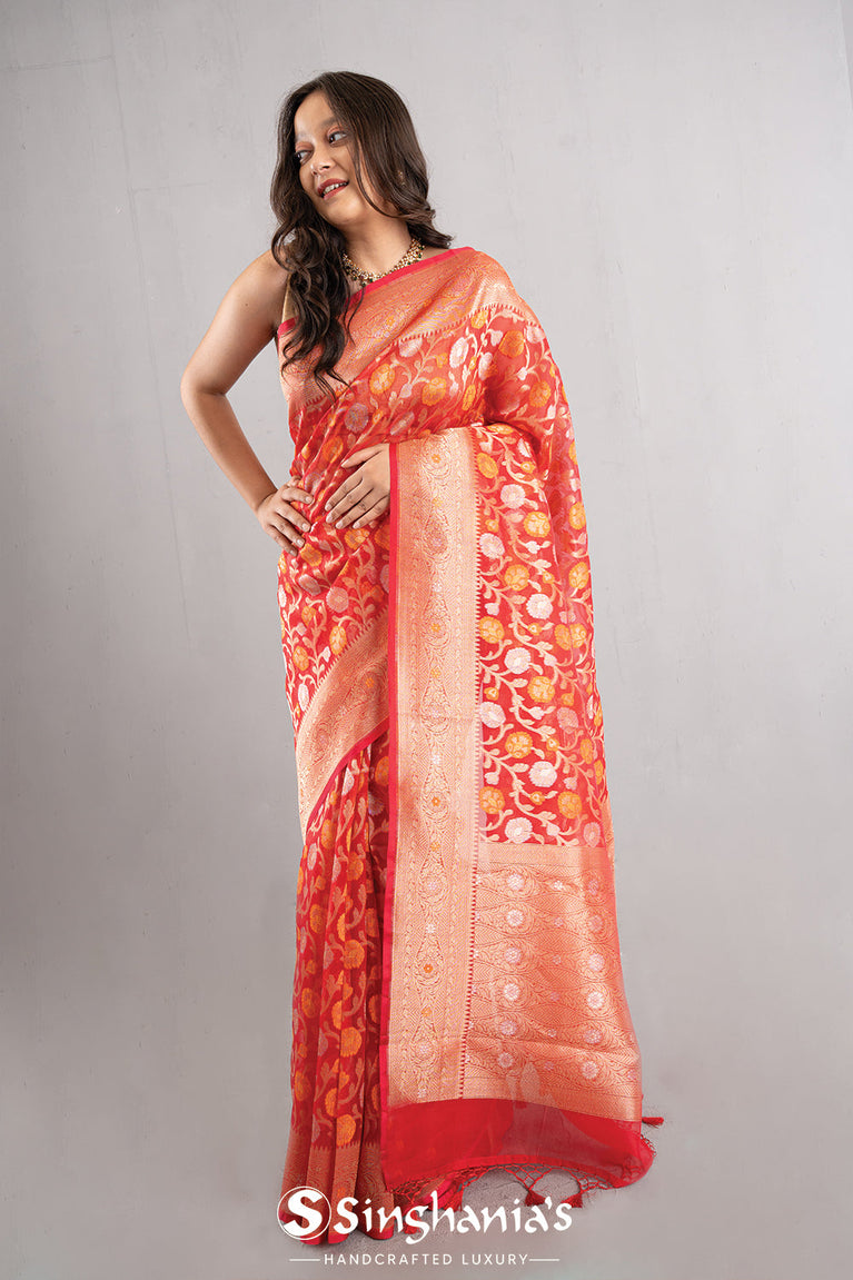 Coral Pink Jaal Organza Banarasi Saree
