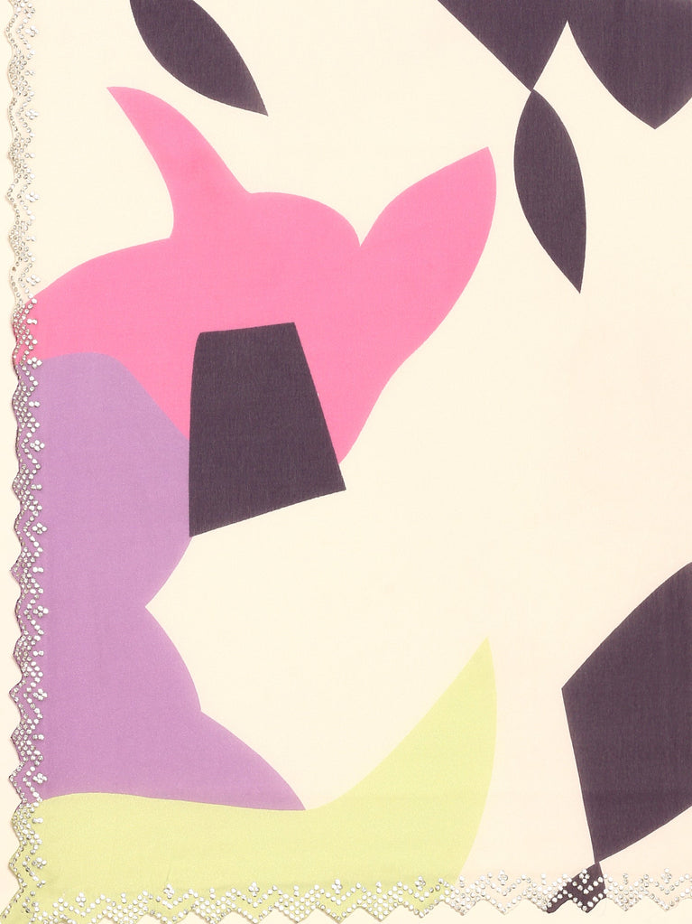 Cream & Purple printed satin saree with Swarovski embroidery