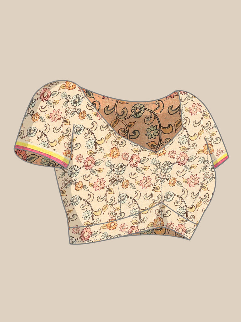 Experience elegance with this cream kota saree featuring intricate kalamkari appliqué work on the pallu. Its lightweight, breathable fabric ensures comfort throughout the day, while the detailed artistry adds a touch of traditional charm. Perfect for festive occasions or casual gatherings, this saree beautifully combines style and comfort to enhance your graceful presence.