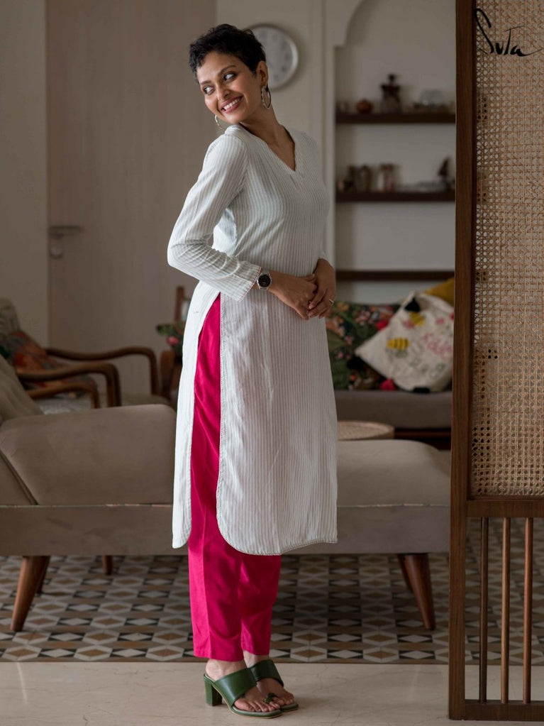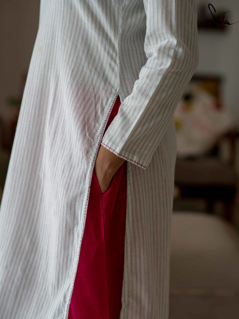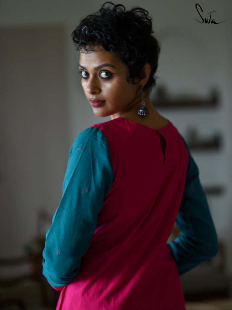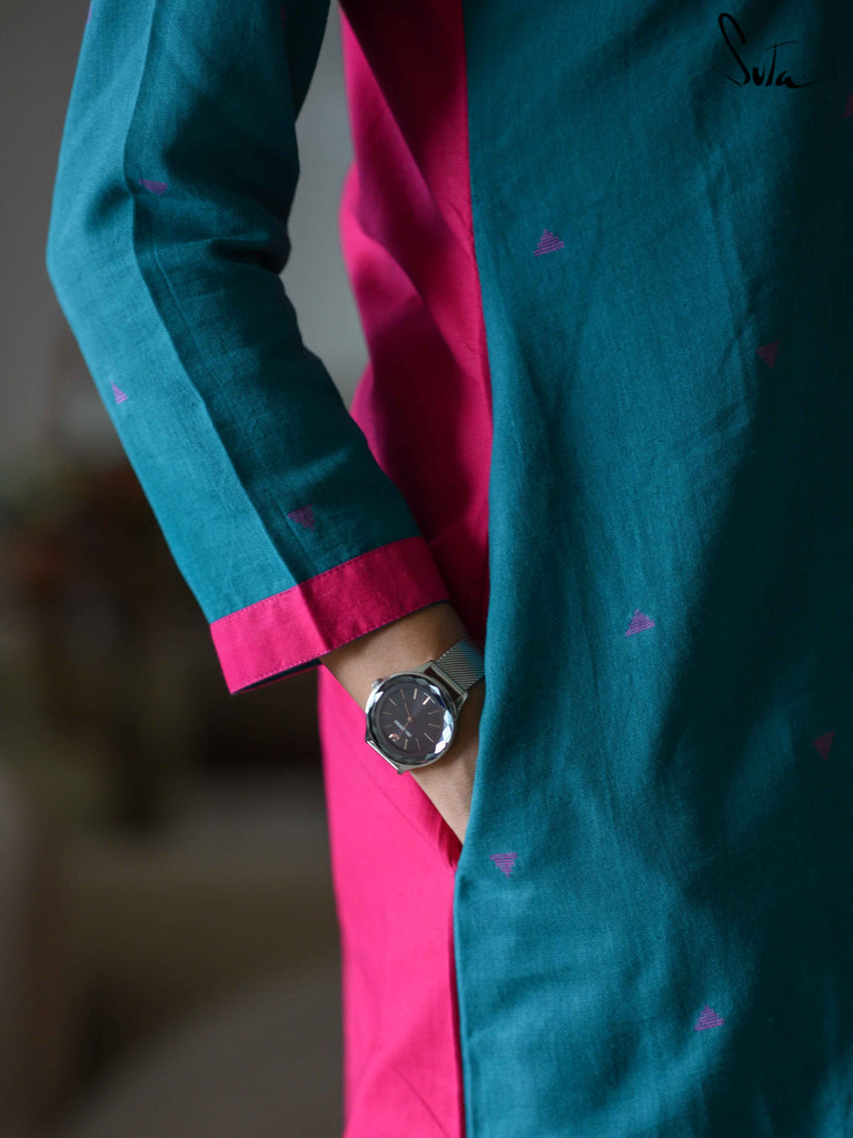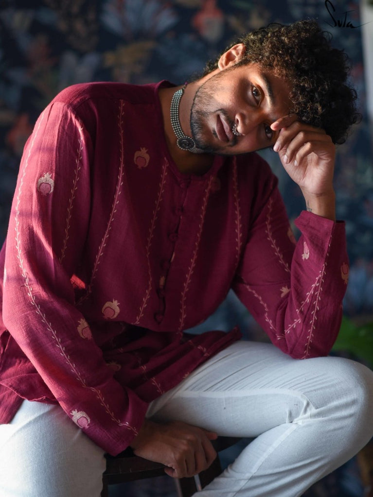 This is a handloom cotton kurta. The beautiful pomegranate-inspired motif that symbolizes the co-existence of contrasts is handwoven into the fabric and brings a gorgeous charm to the kurta. It reflects the idea of breaking stereotypes and looking at things in more than one way, of acceptance and un-labeling.Handloom cotton is a type of fabric that is woven using hand operated looms. Two sets of interlacing yarns, the warp (length) and weft (width), are woven on a mechanised loom operated by weavers. These looms do not use electricity. Human handling lends the fabrics a unique feel and renders the fabrics more value. The art of hand weaving is labour intensive and takes a longer time. But, the beauty it adds to the fabric is priceless. Choosing handloom cotton supports the rich weaving heritage of India and lets the weavers carry on the precious art-form to the future generations as well.