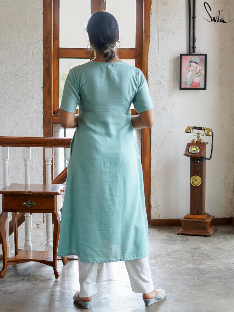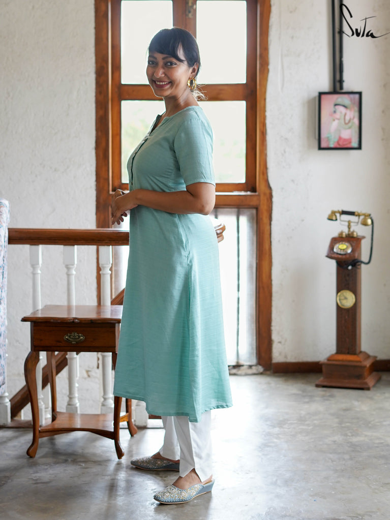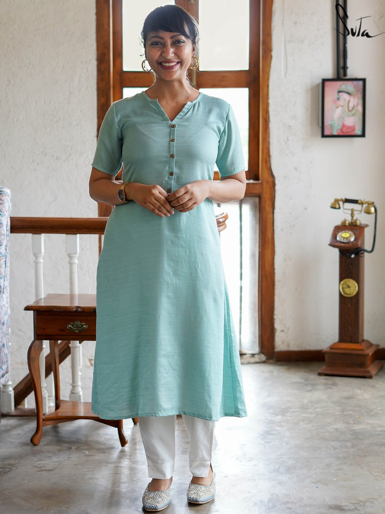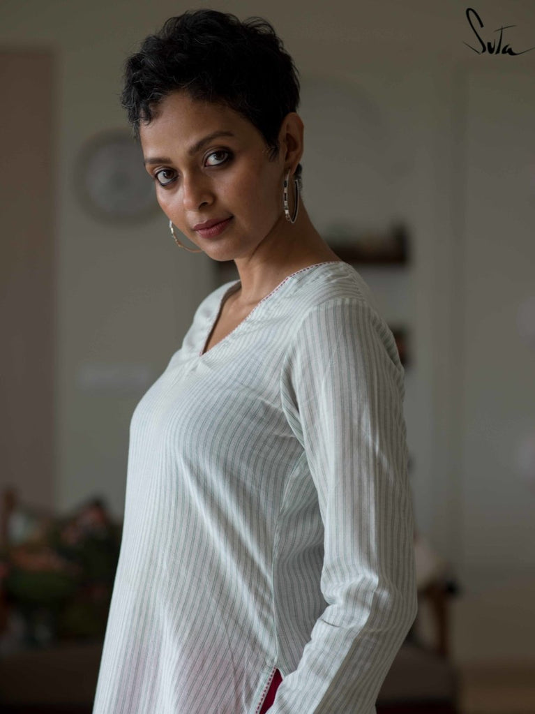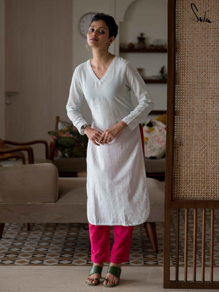 This is a handloom cotton kurta. The beautiful pomegranate-inspired motif that symbolizes the co-existence of contrasts is handwoven into the fabric and brings a gorgeous charm to the kurta. It reflects the idea of breaking stereotypes and looking at things in more than one way, of acceptance and un-labeling.Handloom cotton is a type of fabric that is woven using hand operated looms. Two sets of interlacing yarns, the warp (length) and weft (width), are woven on a mechanised loom operated by weavers. These looms do not use electricity. Human handling lends the fabrics a unique feel and renders the fabrics more value. The art of hand weaving is labour intensive and takes a longer time. But, the beauty it adds to the fabric is priceless. Choosing handloom cotton supports the rich weaving heritage of India and lets the weavers carry on the precious art-form to the future generations as well.
