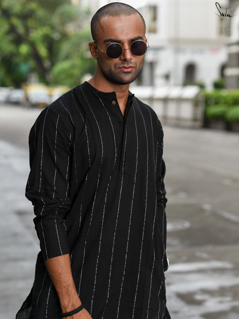 Walk the talk in your own inimitable style, when you wear this smart black cotton kurta.