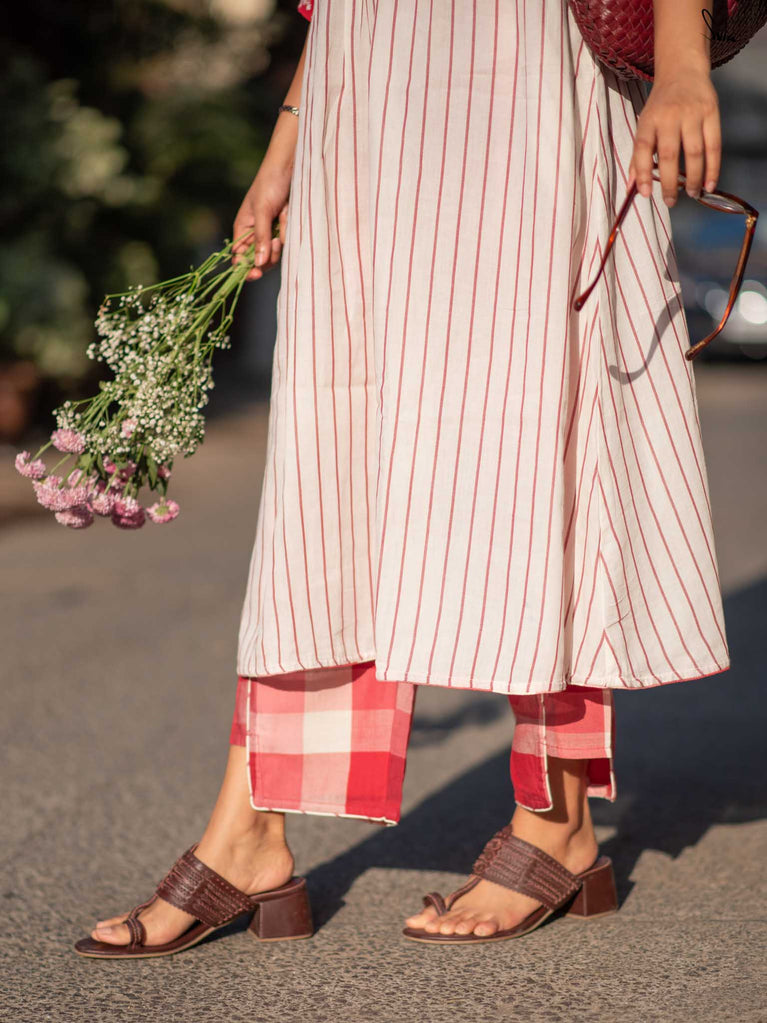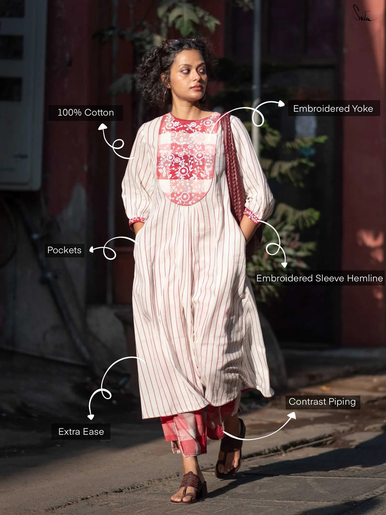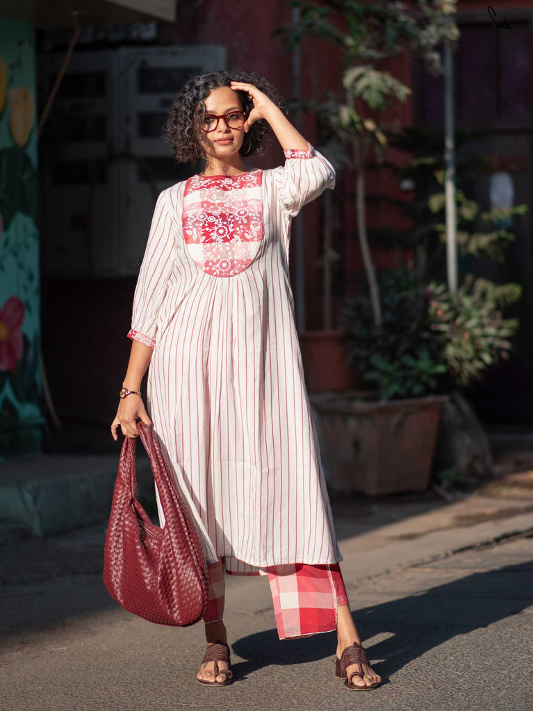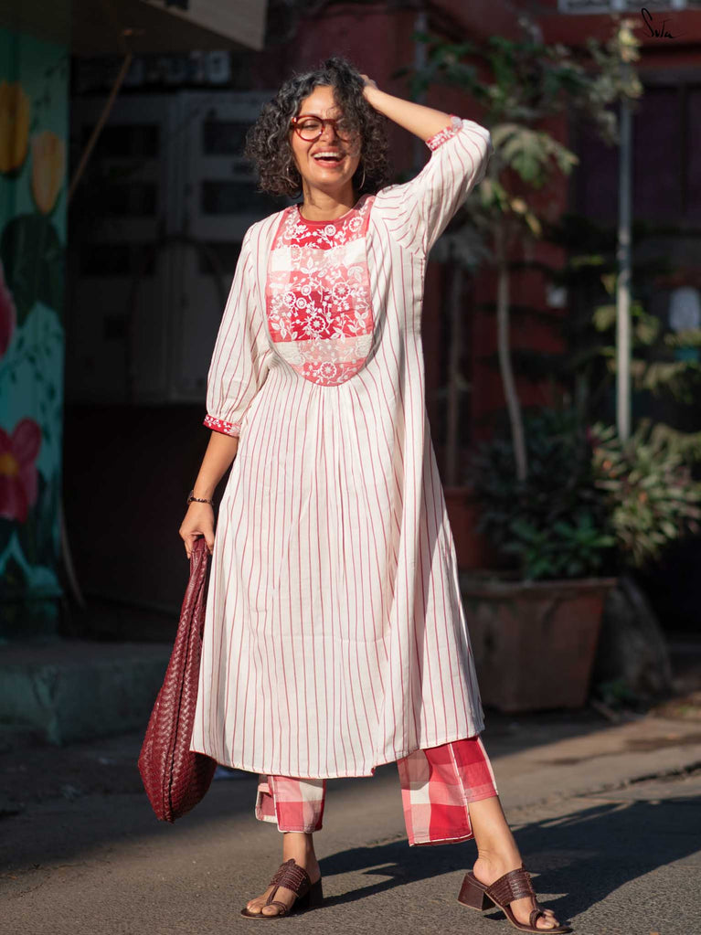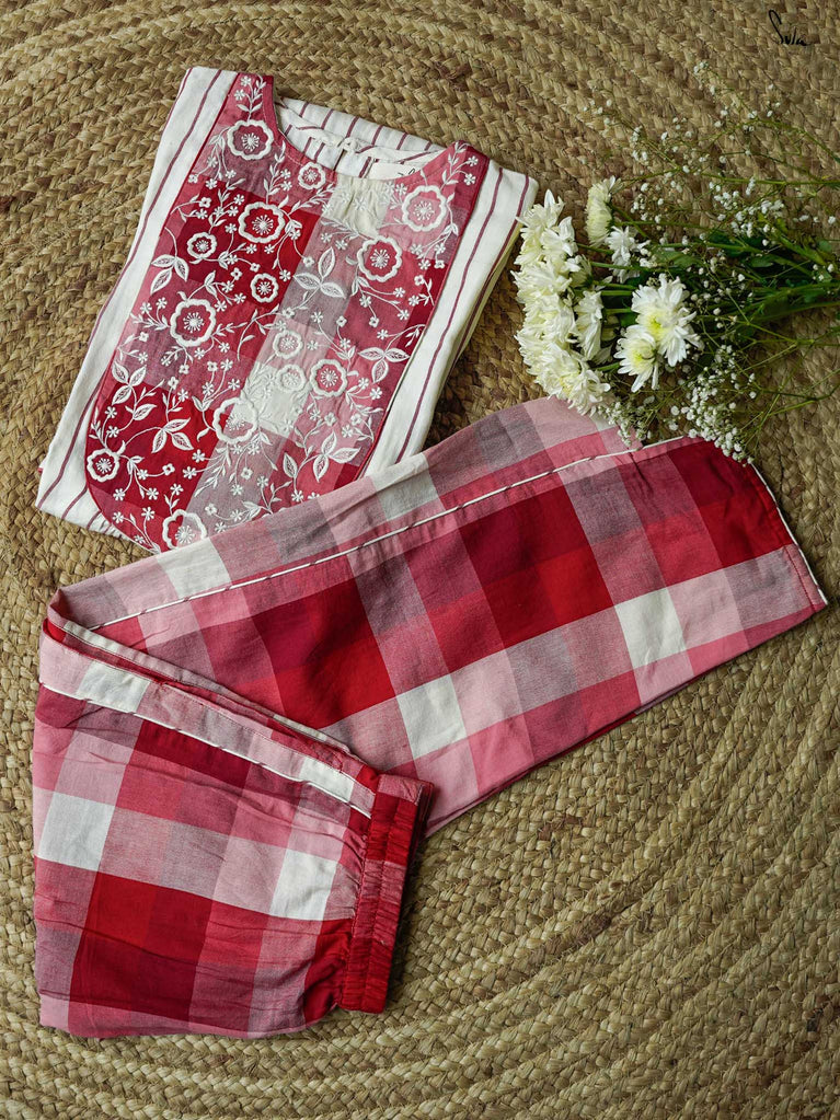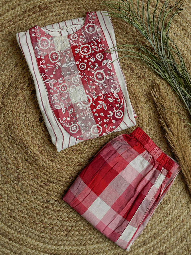 Like the joy of picking your favourite flowers on a whim, this red and white cotton set feels cheerful and spontaneous. The floral-embroidered yoke rests on a checkered weave, blending playful textures. With a round neckline, 3/4th sleeves, and contrast piping, the kurta feels as easy as a breezy day. The pants match in checks is finished with contrast piping and a side slit at the hem for that extra swing.