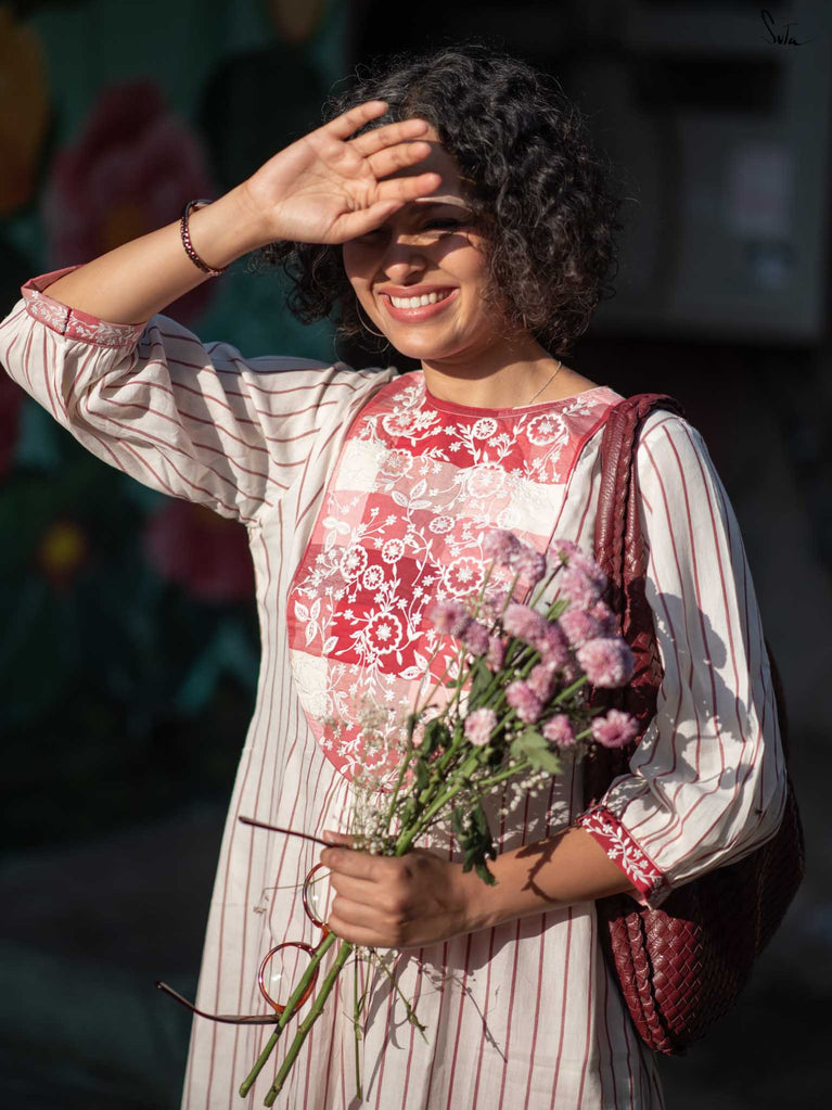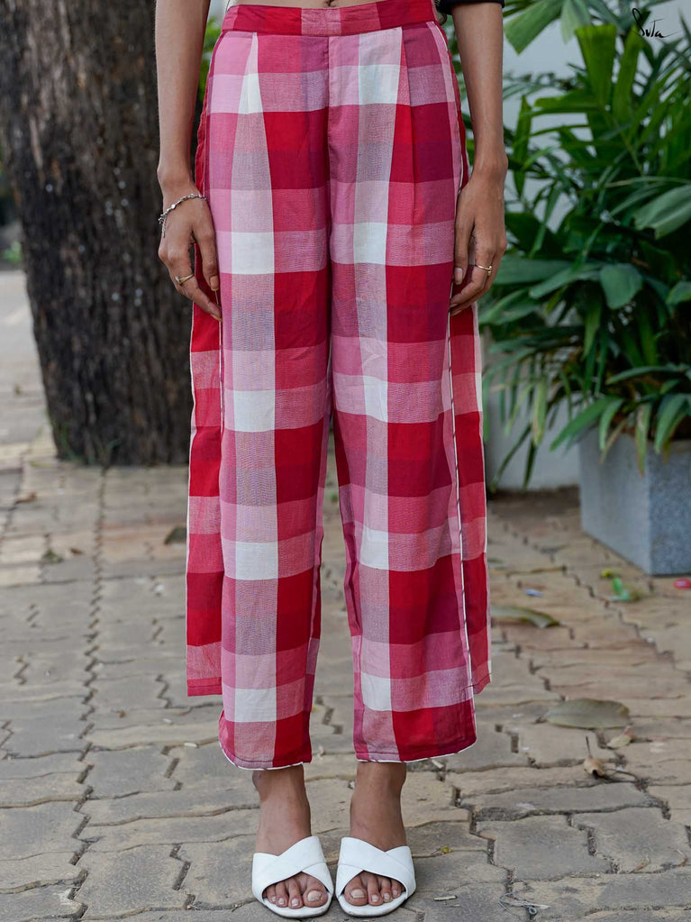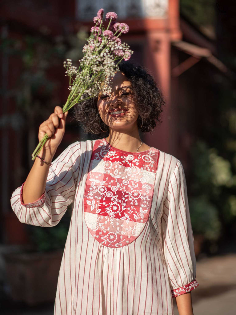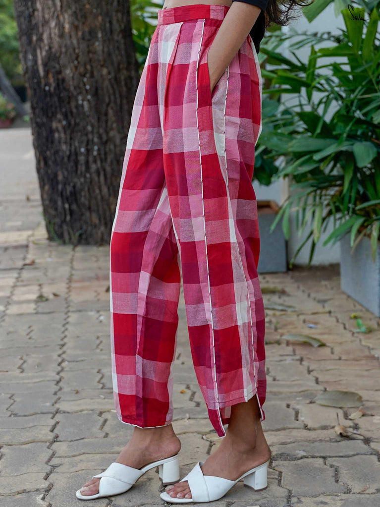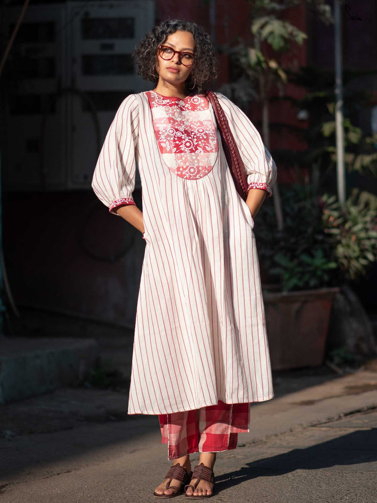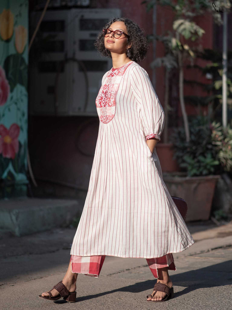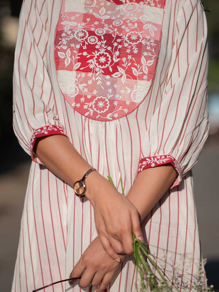 Like the joy of picking your favourite flowers on a whim, this red and white cotton set feels cheerful and spontaneous. The floral-embroidered yoke rests on a checkered weave, blending playful textures. With a round neckline, 3/4th sleeves, and contrast piping, the kurta feels as easy as a breezy day. The pants match in checks is finished with contrast piping and a side slit at the hem for that extra swing.