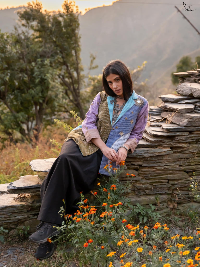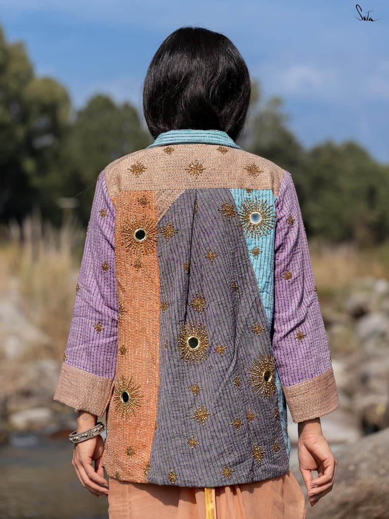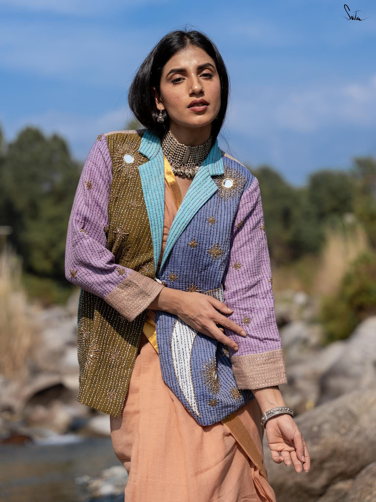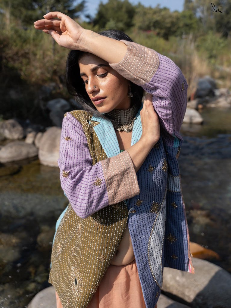 Arue celebration of craftsmanship, Chand Buta from Suta’s Bageecha collection reflects the immense time, love, and hard work that our artisans have invested. The jacket is hand-quilted in a multicolor fabric, with the Katha running stitches laying the foundation for its vibrant design. The stunning mirror work, bead embellishments, and zari embroidery are all carefully handcrafted, requiring meticulous skill and hours of patience. These elements give the jacket its glamorous and festive feel, making it a unique piece that stands out. The artisans love for their craft is evident in every stitch and bead, as they pour their heart into transforming the fabric into a work of art. The jacket is not just a piece of clothing, but a canvas of tradition and modernity, woven together with love and time. Each element is passed from one pair of hands to another, carrying the stories and dedication of the craftsmen who have worked tirelessly to create something beautiful.