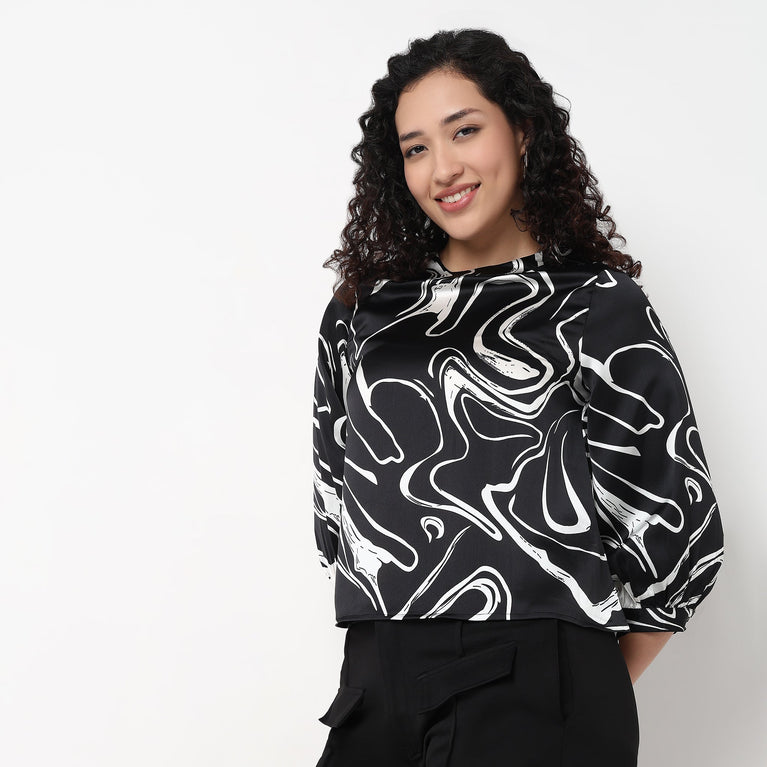 Black Printed Modal Satin Straight Top