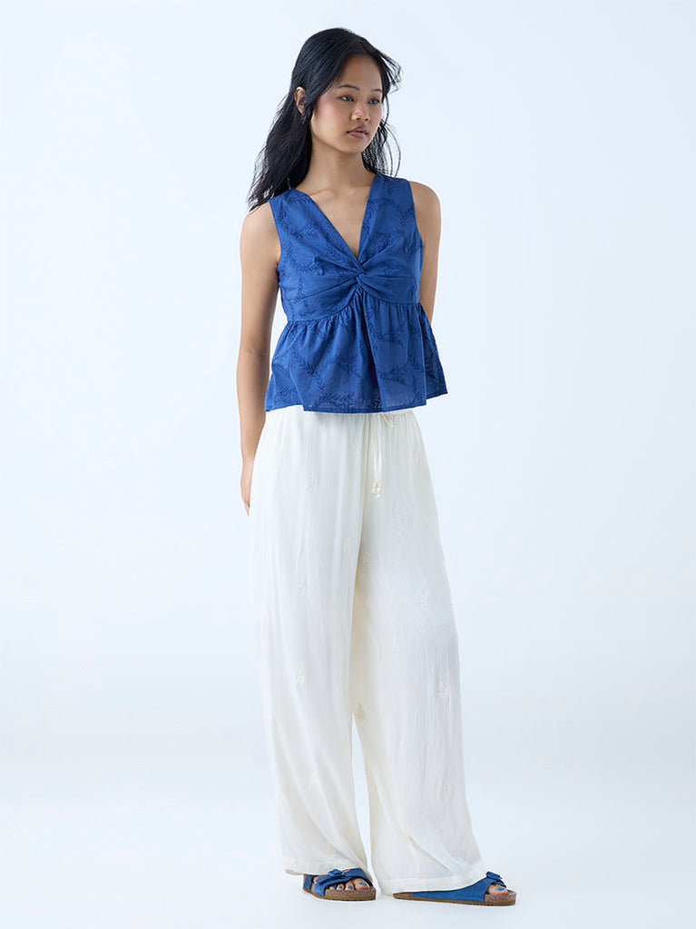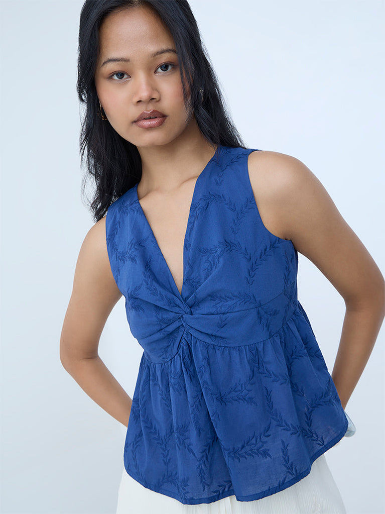 This indigo top from Bombay Paisley is crafted from pure cotton and spotlights leaf embroidery that lends a touch of contemporary finesse. The knotted bodice adds shape and dimension, while the V-neck and sleeveless cut keep it breezy and versatile.