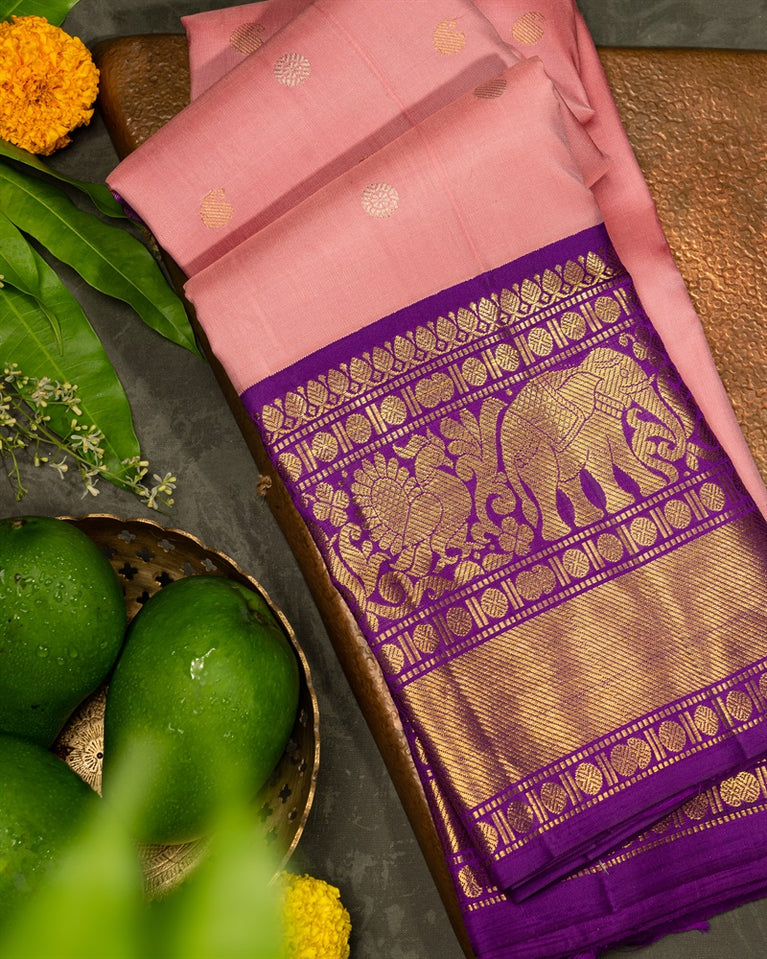 Varamahalakshmi Peach Pink & Purple Kanchipuram Buttis Saree