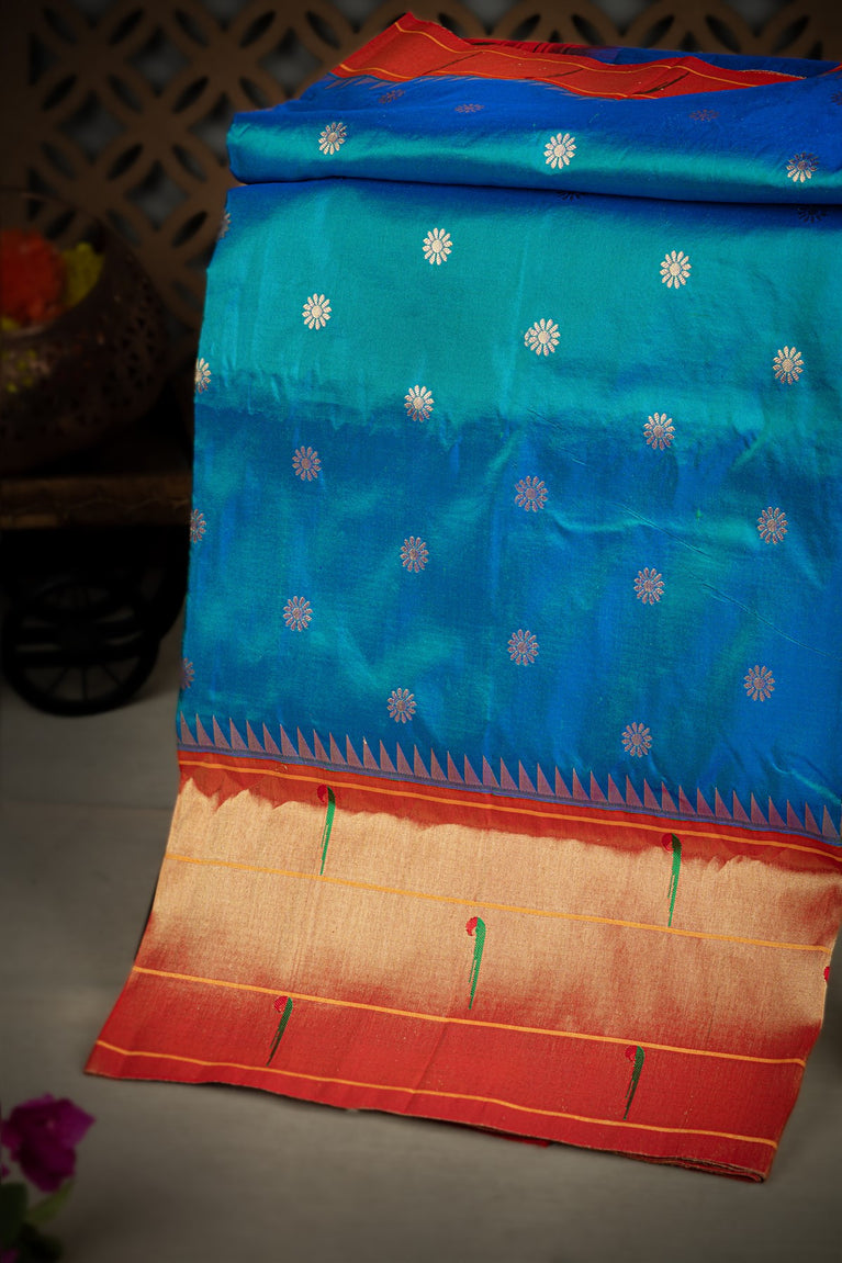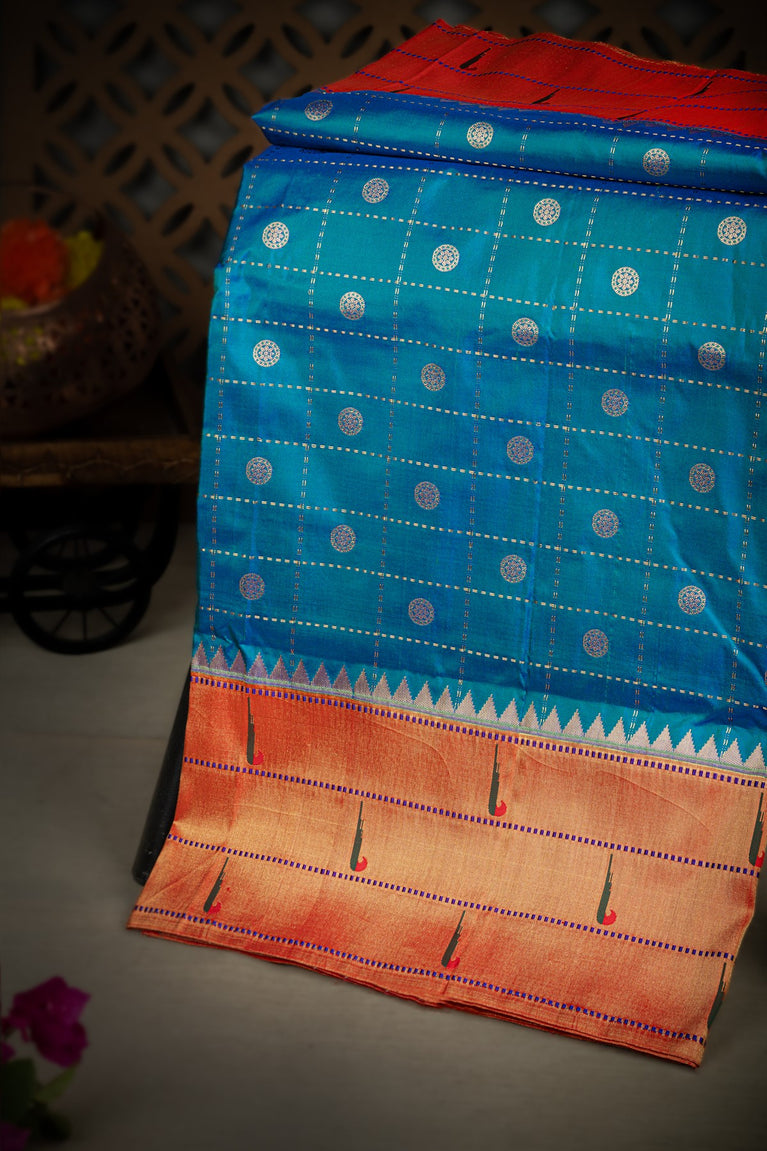 Varamahalakshmi Peacock Blue & Red Paithani Buttis Saree