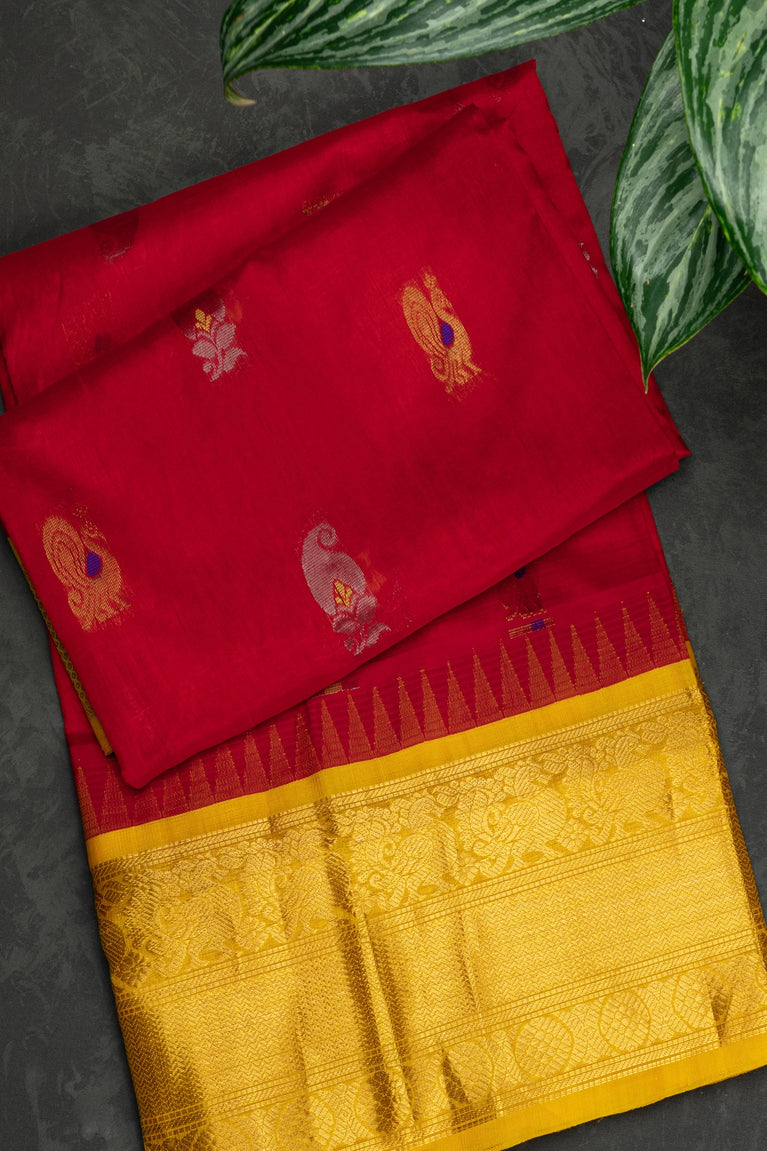 Varamahalakshmi Red & Mustard Kuppadam Buttis Saree