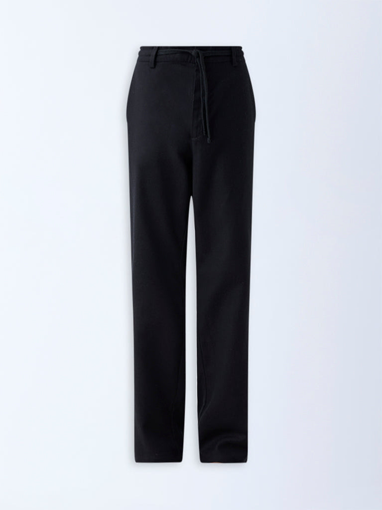 Made for slow mornings and spontaneous getaways, these black pants from ETA bring easy polish to off-duty dressing. Crafted from a soft cotton-blend fabric with a refined textured finish, they balance comfort and structure effortlessly. The relaxed fit offer laid-back ease, while the elasticated waistband, adjustable drawstrings, and side pockets keep it functional.