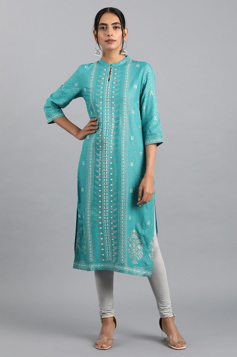 Blue mandarin neck 3/4 sleeve kurta with printed detail.