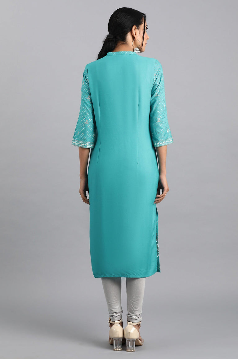 Blue mandarin neck 3/4 sleeve kurta with embroidered detail.
