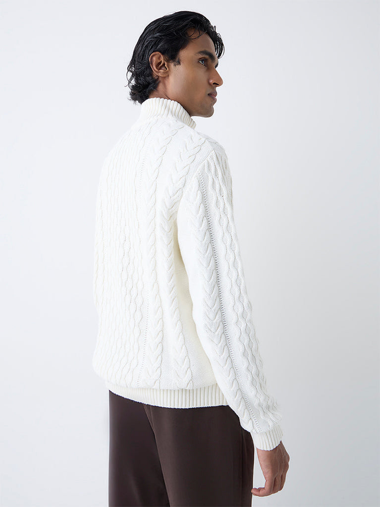 Ascot introduces this white sweater built in a relaxed frame from luxurious-blend fabric. Showcasing a cable-knit texture, it is framed with a polo neck and full sleeves, making it an easy essential for refined casual wear.