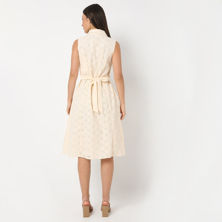 Below Knee Sleeveless Shirt Collar Schiffli Flare Fit Dress