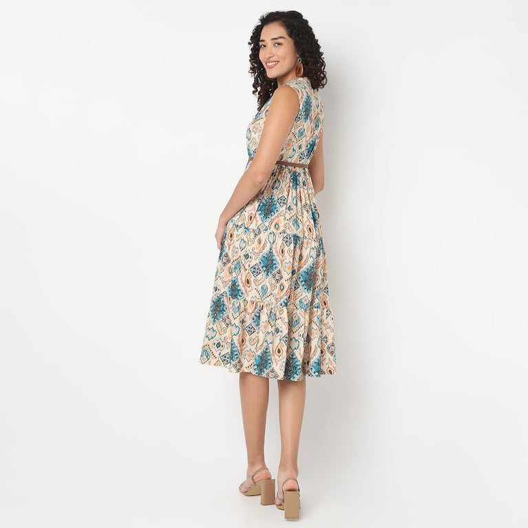 Below Knee Sleeveless Flare Fit Printed Kurta