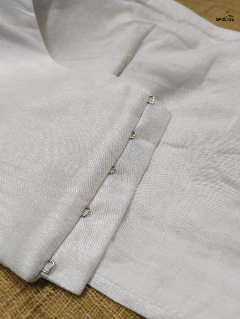 Featuring a machine-embroidered pattu set, for grooms. It's a gold zari-based embroidery on the collar neckline and cuffs. its a set along with a single zari bordered elastic dhoti with gold plain zari borders Kaduva.