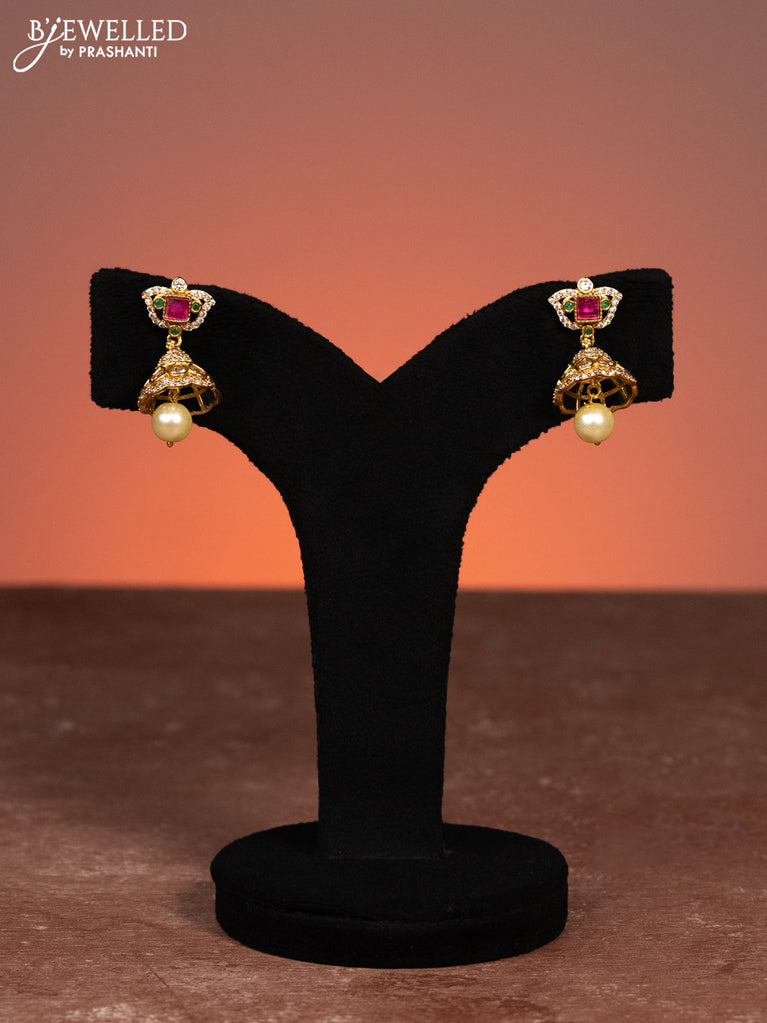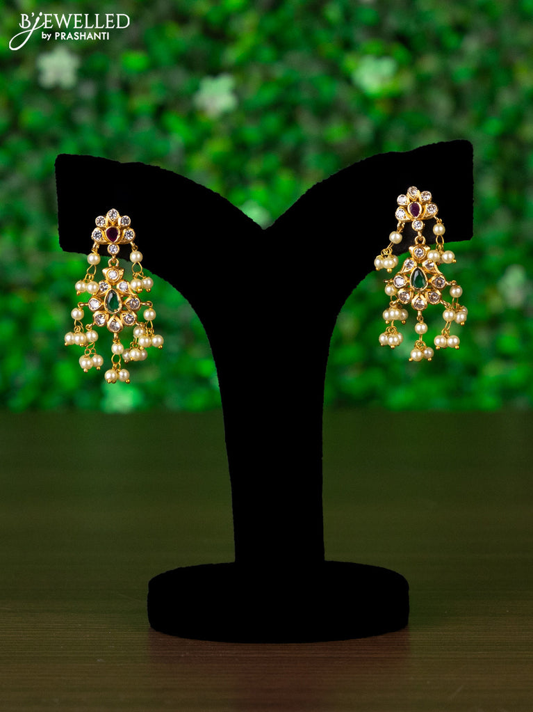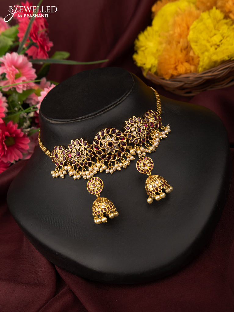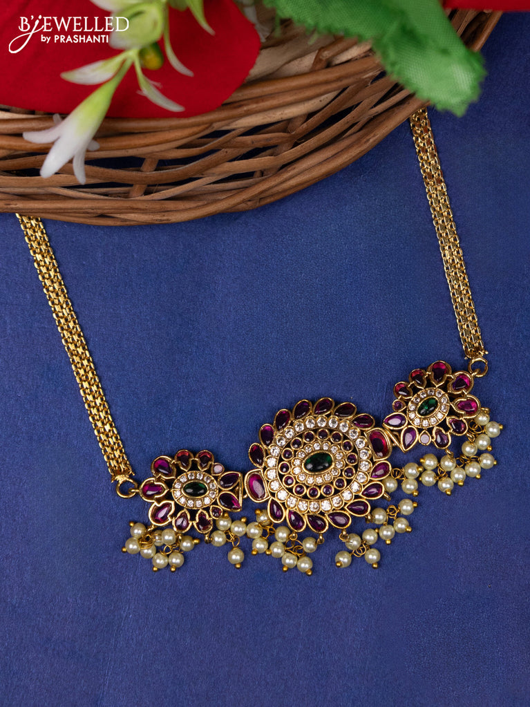 Antique choker with red ,green and white kundan stones and pearl drops