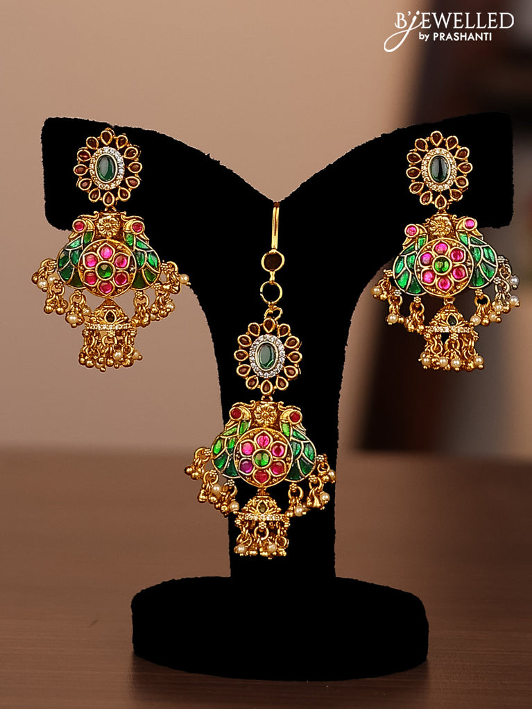 Antique combo set peacock design with jadau kundan stones and pearl & green beads hanging