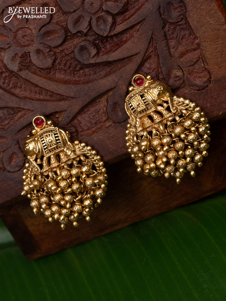 Antique earring elephant design with pink kemp stone and golden beads hanging