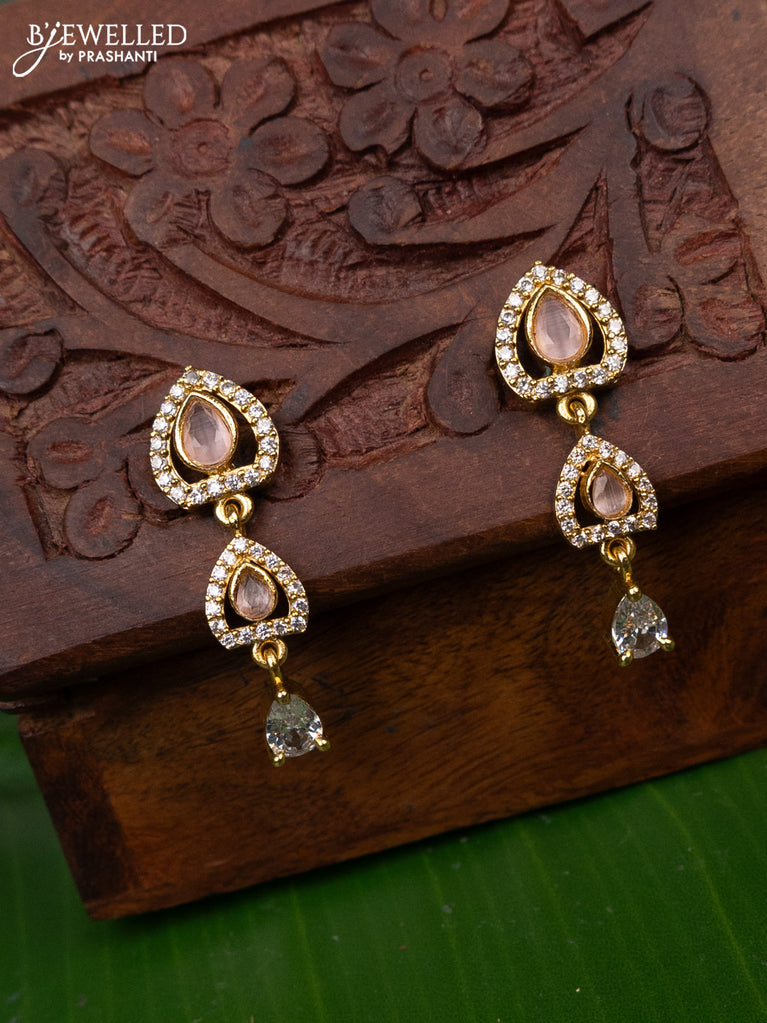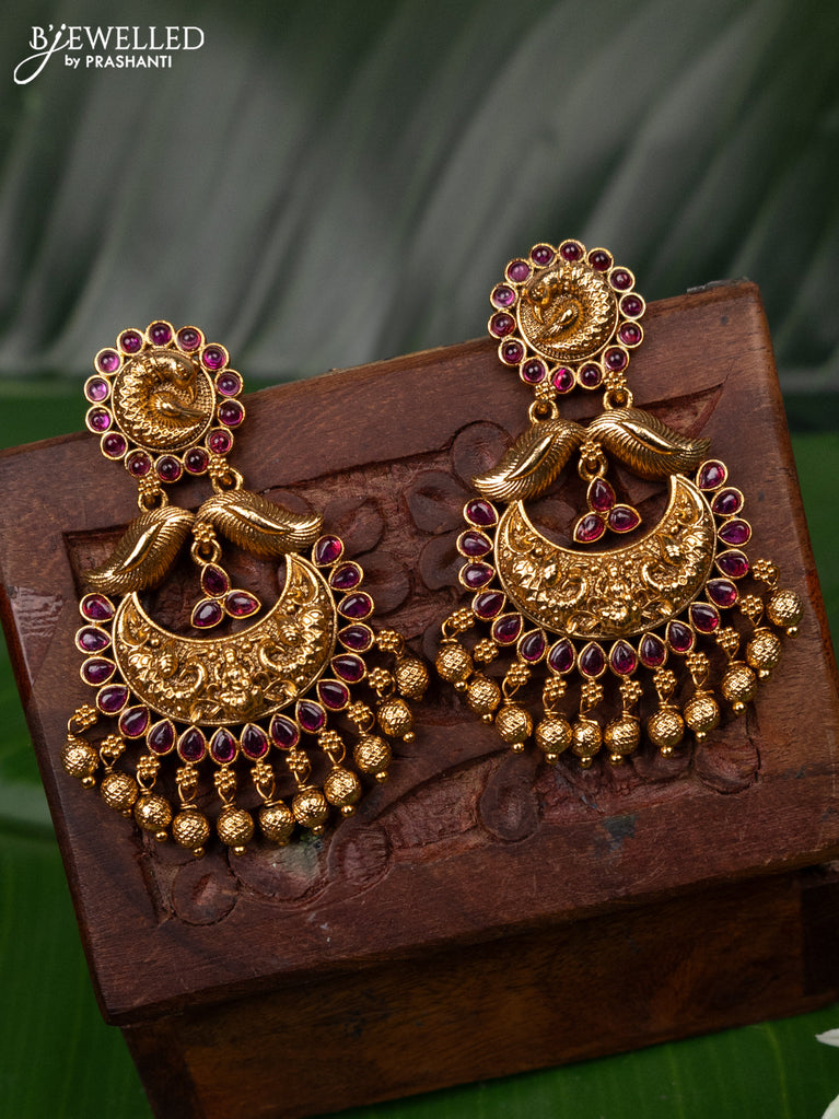 Antique earring peacock & lakshmi design with pink kemp stones and golden beads hanging