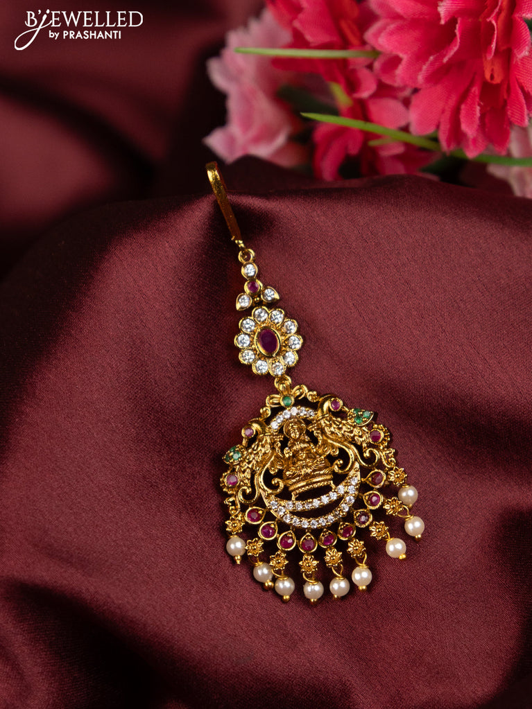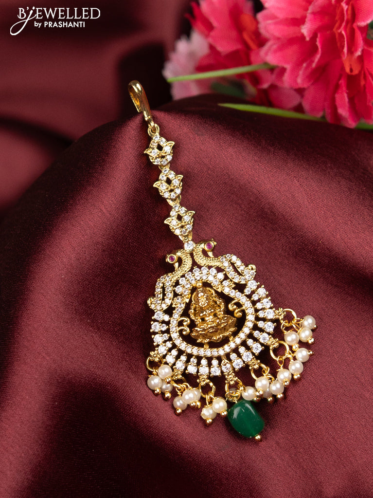 Antique maang tikka lakshmi design with kemp & cz stones and pearl hangings