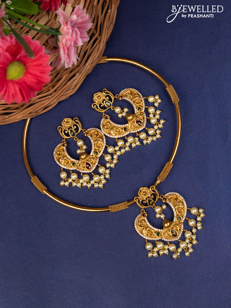 Antique ring type choker with kemp & cz stone and pearl hangings