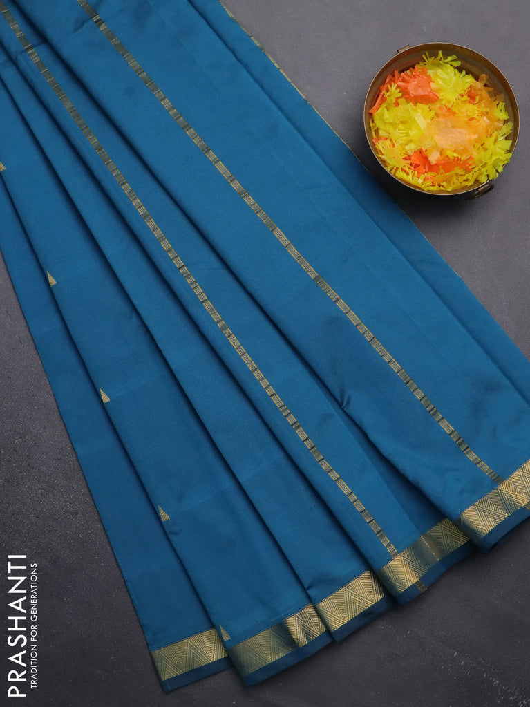 Arani semi silk saree peacock blue with plain body and small zari woven border
