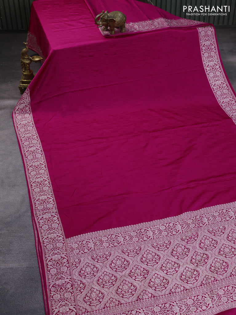 Banarasi crush crepe saree pink with plain body and silver zari woven floral border