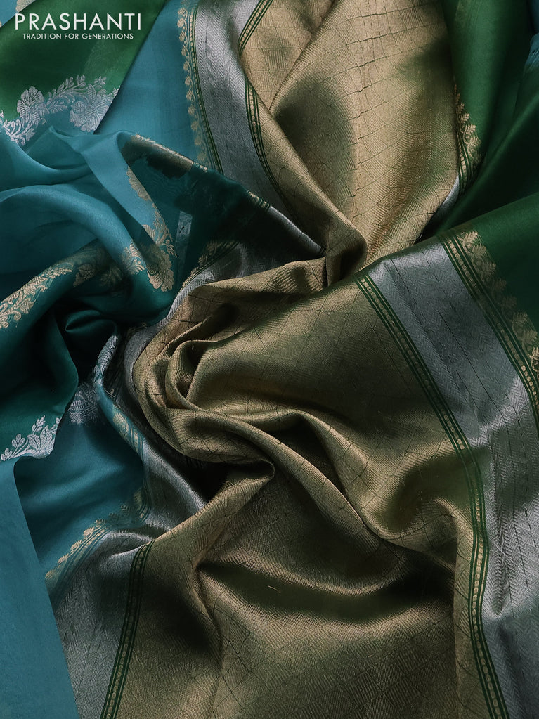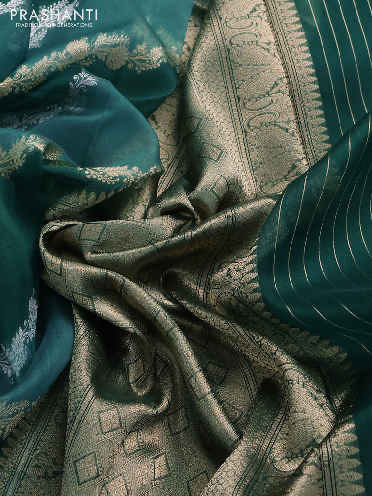 Banarasi organza silk saree teal green shade with silver & gold zari weaves and zari woven piping boder