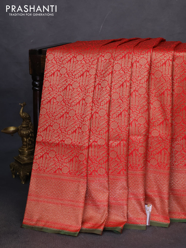 Banarasi semi katan saree red and green with allover thread & zari woven brocade pattern and woven border