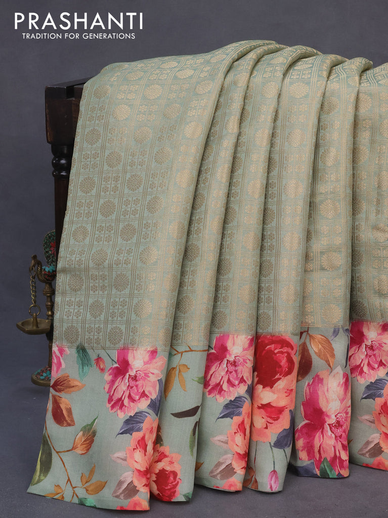 Banarasi silk saree pastel green with allover zari woven brocade weaves and floral digital printed border