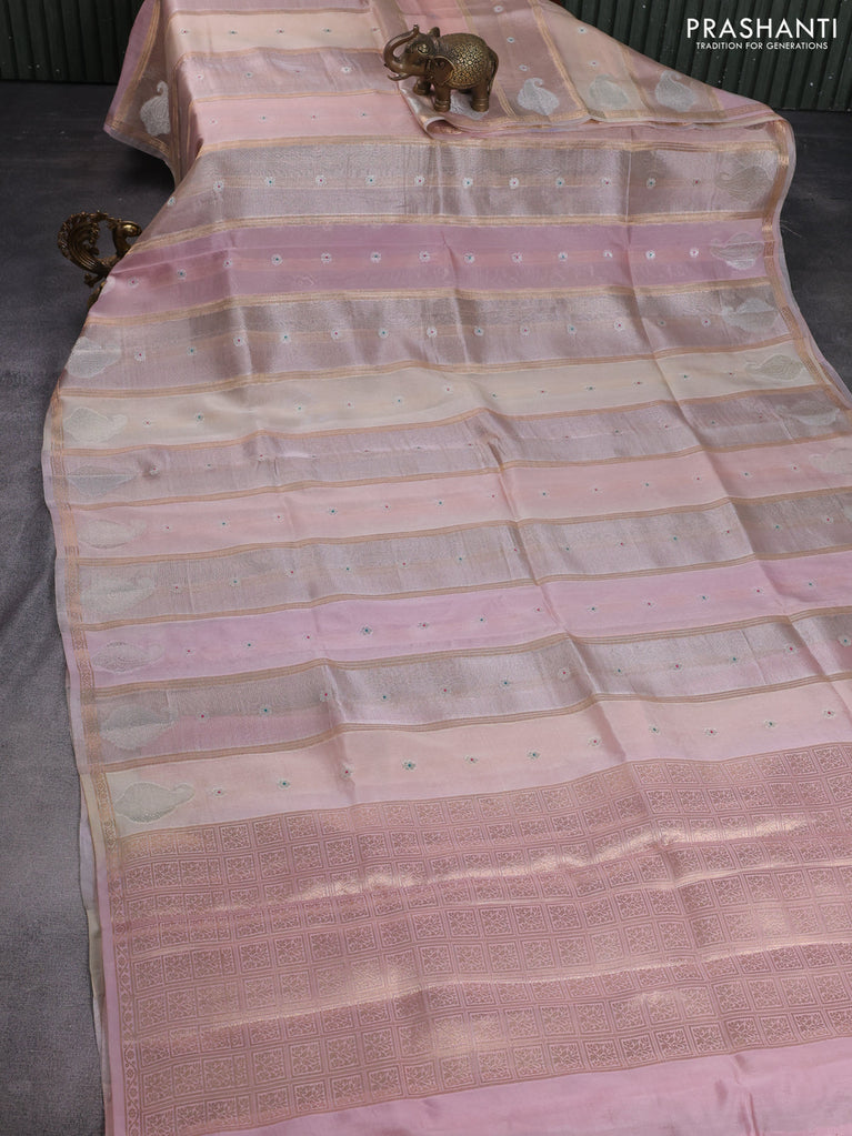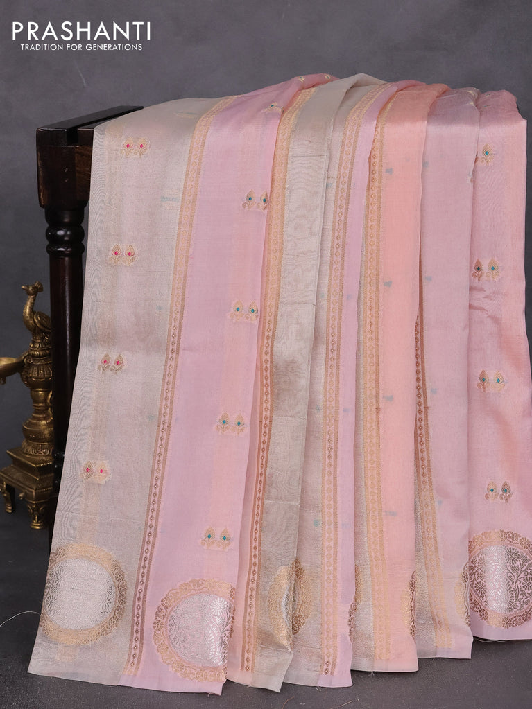 Banarasi tissue semi silk saree peach pink and beige with zari weaves & floral buttas and silver zari woven butta border