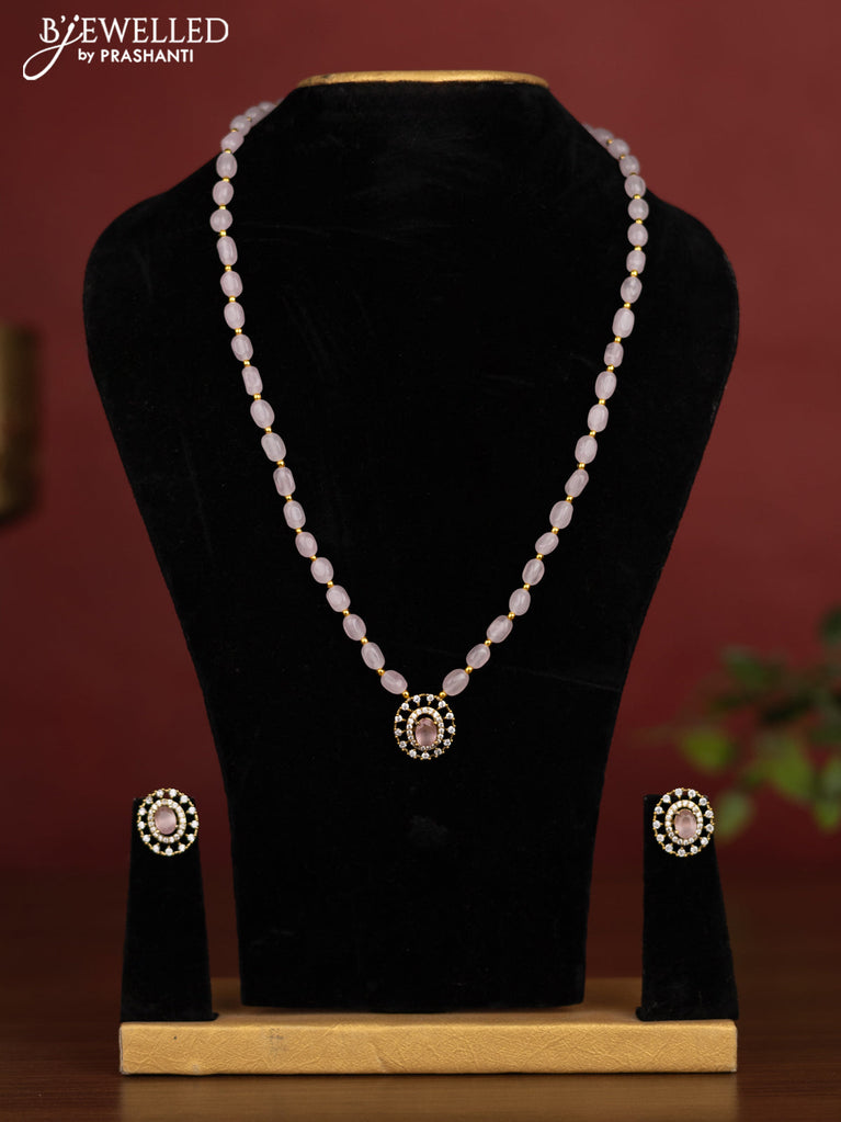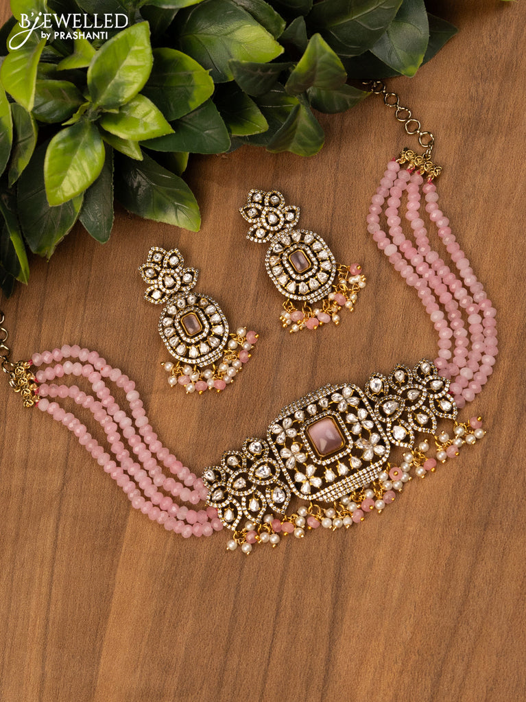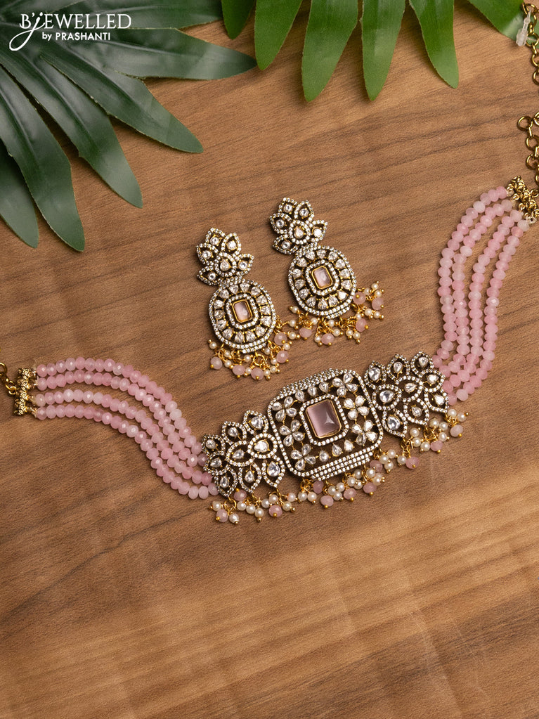 Beaded baby pink choker with kundan & cz stones and pearl hangings in victorian finish