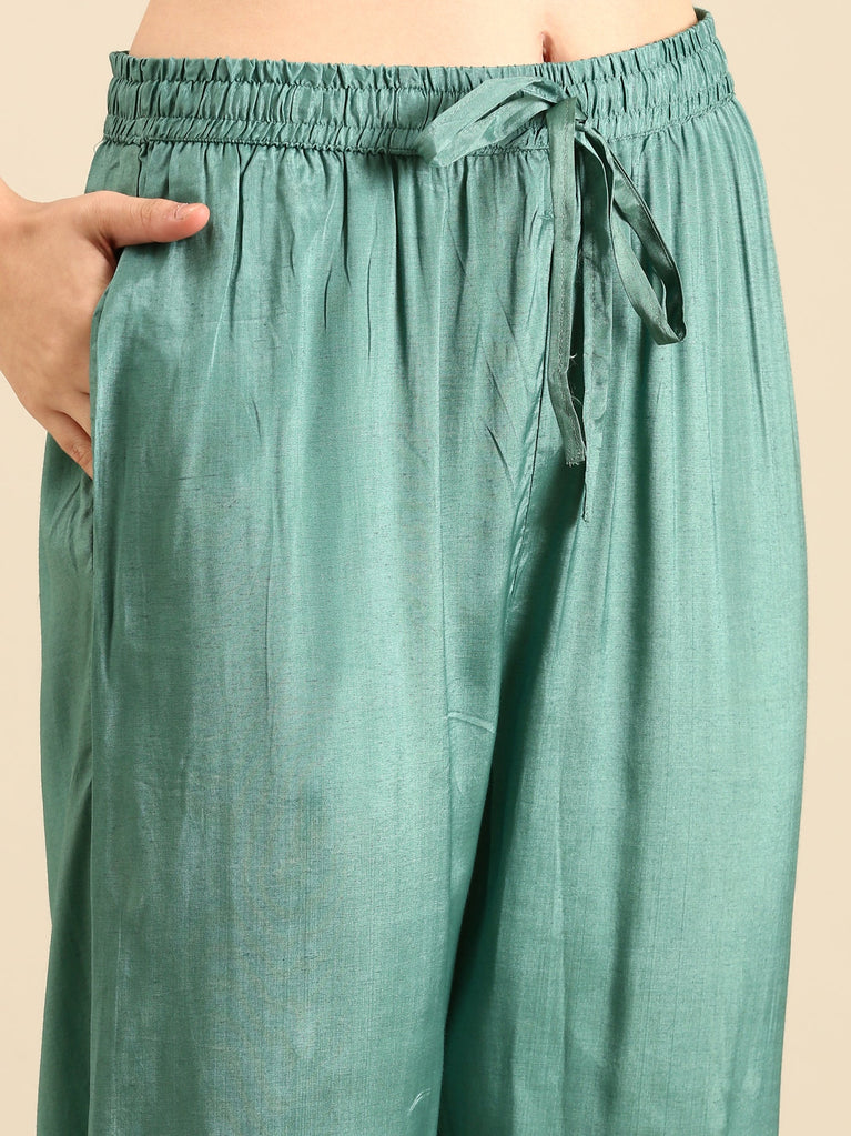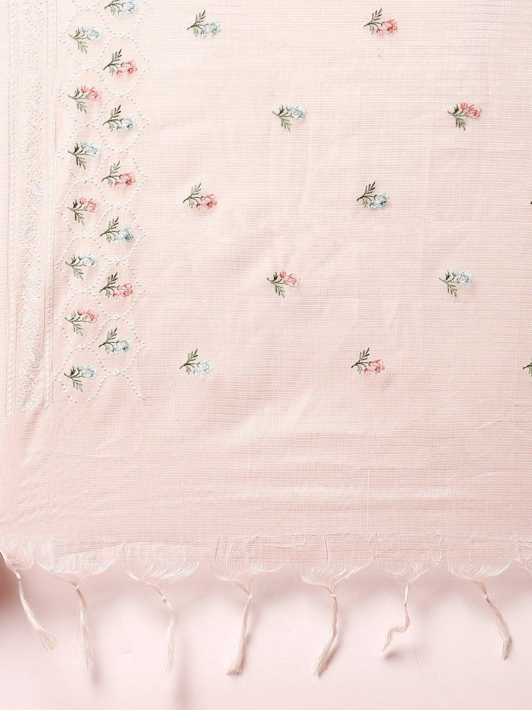 Crafted In Cotton Slub Fabric, This Block Printed Kurta Set Is A Must-Have For Summer. The Kurta Has Front Dabka And Sequin Embroidery. It Is Paired With Matching Straight Pants And Cotton Kota Dupatta.