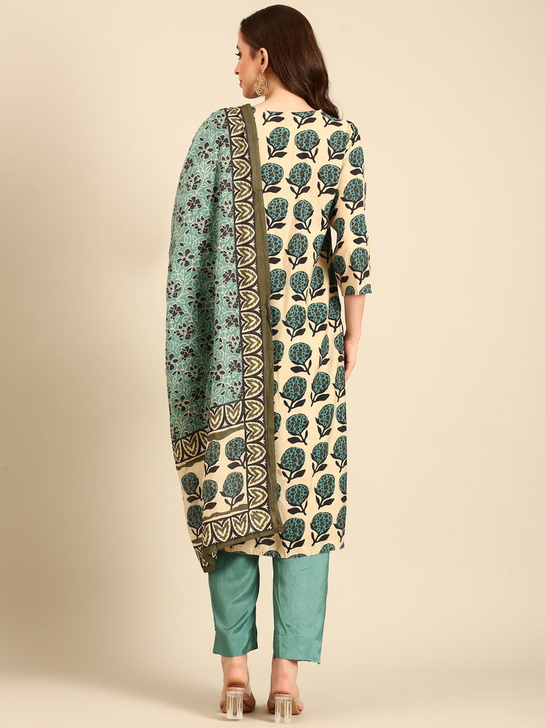Beige Block Printed Cotton Slub Kurta, Pants And Dupatta Set