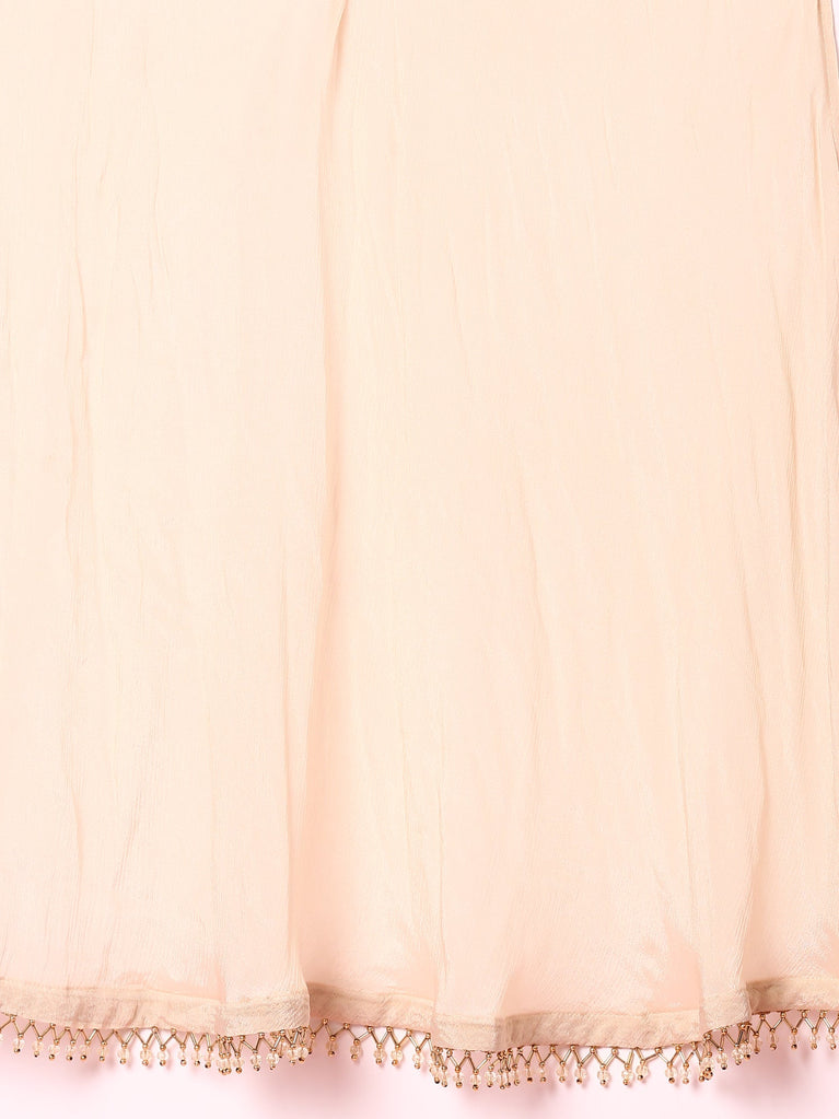 This beige Chanderi three-piece set features delicate handwork that adds an elegant, timeless charm to your wardrobe. Crafted from breathable fabric, it ensures comfort throughout the day while its intricate detailing elevates your look for both casual and festive occasions. Perfect for those seeking a blend of tradition and style, this set is a versatile addition that supports your desire for effortless grace.