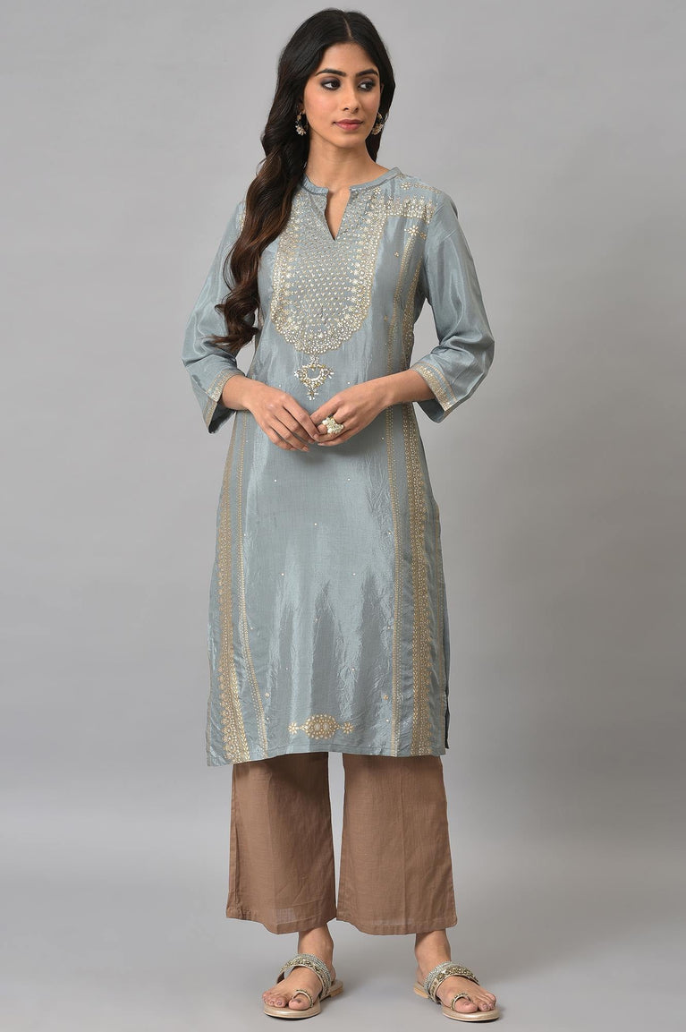 Beige glitter print kurta with embroidery on centre front. The kurta has mandarin collar and three-quarter sleeves.