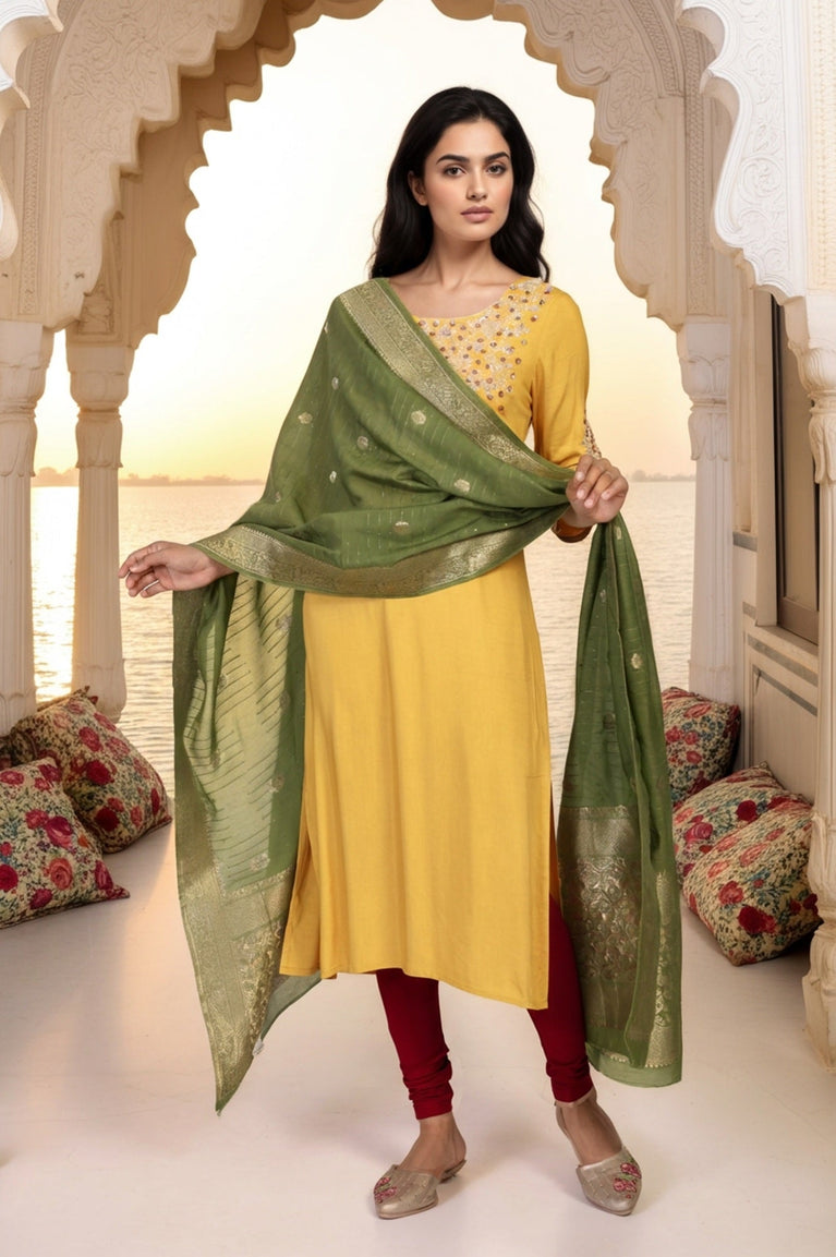 Woven poetry in every thread, this kurta set for women redefines timeless elegance for the modern wardrobe. The ensemble is anchored by a stunning Golden Sand kurta, meticulously crafted from a lustrous jacquard fabric that glides with a subtle, celebratory sheen. Delicate, shimmering buti motifs are woven throughout its A-line silhouette, creating a rich tapestry of texture that catches the light beautifully. You’ll adore the thoughtful details in this exquisite kurti set, from the sophisticated mandarin collar with its neat front slit to the practical three-quarter sleeves. The straight hemline is beautifully grounded by a wide, contrasting border in a deep Crimson Ruby, a vibrant detail that’s mirrored perfectly on the sleeve cuffs for a cohesive look. This stunning ethnic co-ord set pairs the tunic with comfortable, solid Crimson Ruby palazzo pants, creating a bold, harmonious contrast. The true showstopper is the lavishly woven dupatta, a cascade of intricate paisley and floral artistry in matching Crimson Ruby that drapes magnificently. Opaque and impeccably styled, this complete three-piece ensemble promises grace and poise for all your festive occasions.