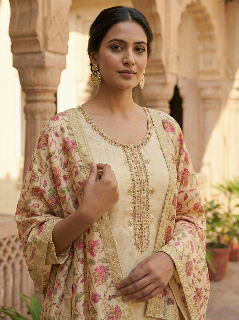 Elevate your ethnic wardrobe with this stunning beige silk suit set, featuring intricate floral digital prints that blend traditional elegance with contemporary design. Crafted from premium silk fabric, this ensemble offers a luxurious drape and comfortable fit perfect for festive occasions, celebrations, or sophisticated everyday wear. The delicate floral patterns add visual interest and dimension, making it a versatile choice that pairs beautifully with traditional jewelry and accessories. Experience the perfect balance of timeless style and modern artistry with this exquisite piece that promises to become a cherished favorite in your collection.