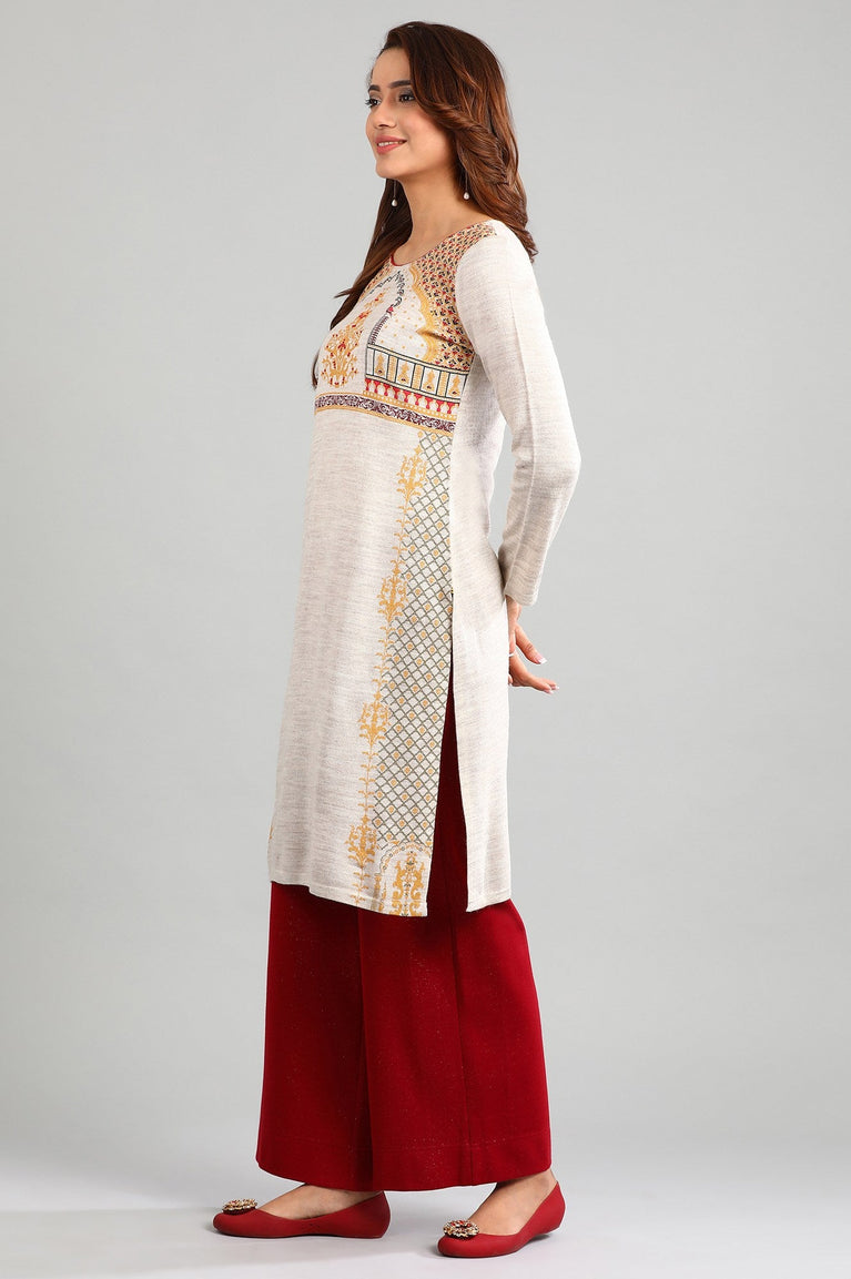 Beige round neck full sleeve kurta with printed detail, tie-up detail on the waist and side slits.