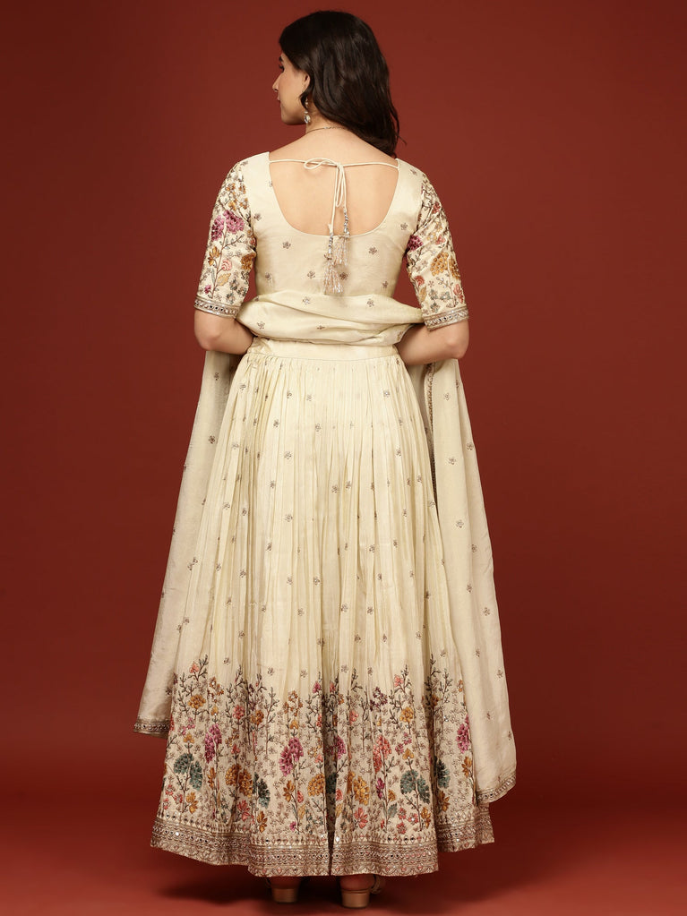 Elevate your traditional wardrobe with this Beige Silk Ghagra Set adorned with delicate floral motifs. Crafted from luxurious silk, it offers a graceful drape and a refined sheen, perfect for festive occasions or weddings. The subtle beige color combined with intricate floral detailing exudes timeless elegance, making it a versatile choice for those who appreciate classic sophistication. Comfortable yet stylish, this set promises to enhance your presence with understated charm.