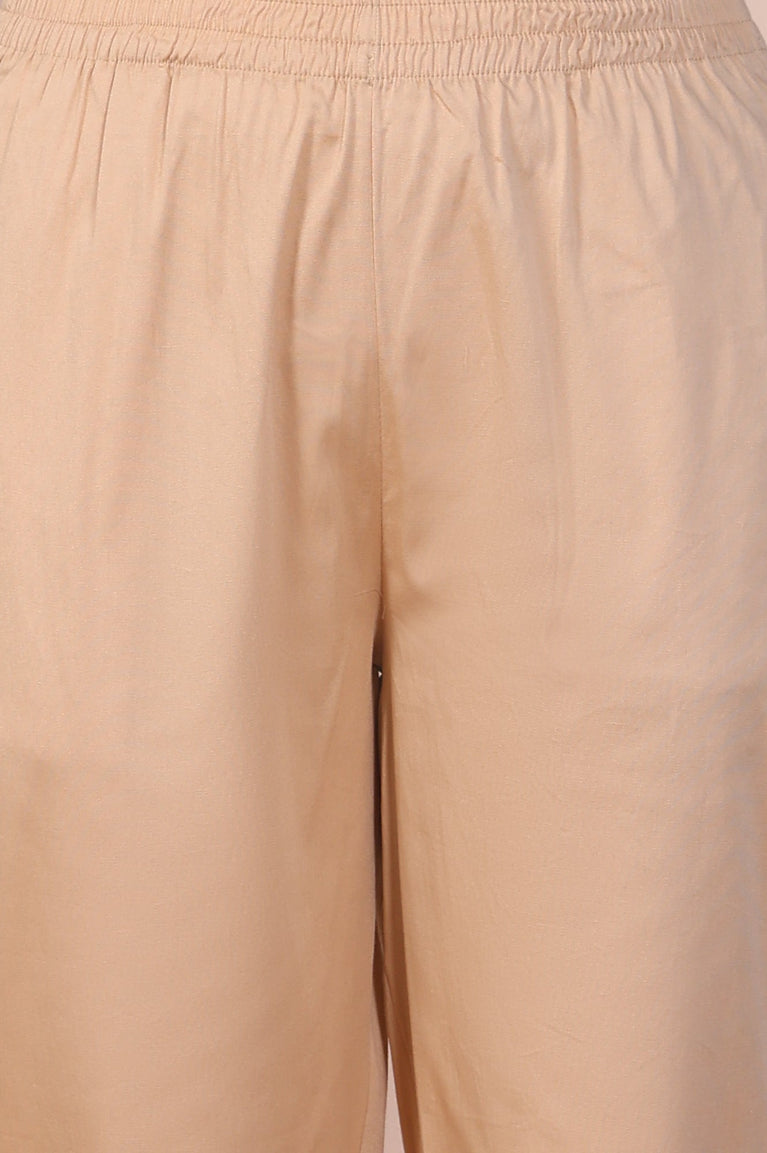 Beige Solid Straight Fit Cotton Trousers With Elasticated Waist
