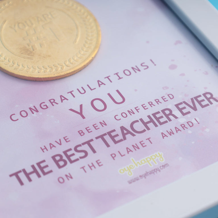 Teachers deserve all the appreciation in this world for everything they do. Give your favorite teacher the ultimate compliment with our Best Teacher Certificate. This sweet and adorably cute frame comes with a medal (yes, a real medal) that certifies your Teacher as the Best Teacher Ever. Go ahead, make their day! Specifications: Size of the Frame - 12.5 x 17.5 cm Material of the Frame - Wood