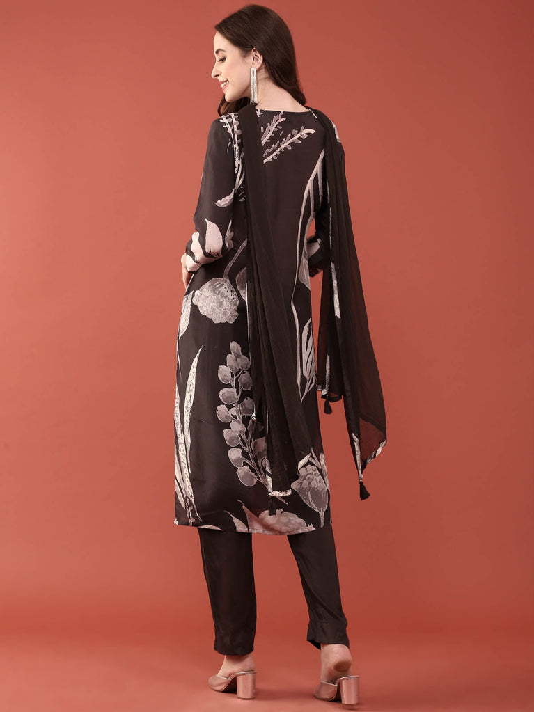 Black Embroidered A-Line Kurta with Straight Pant and Dupatta Set